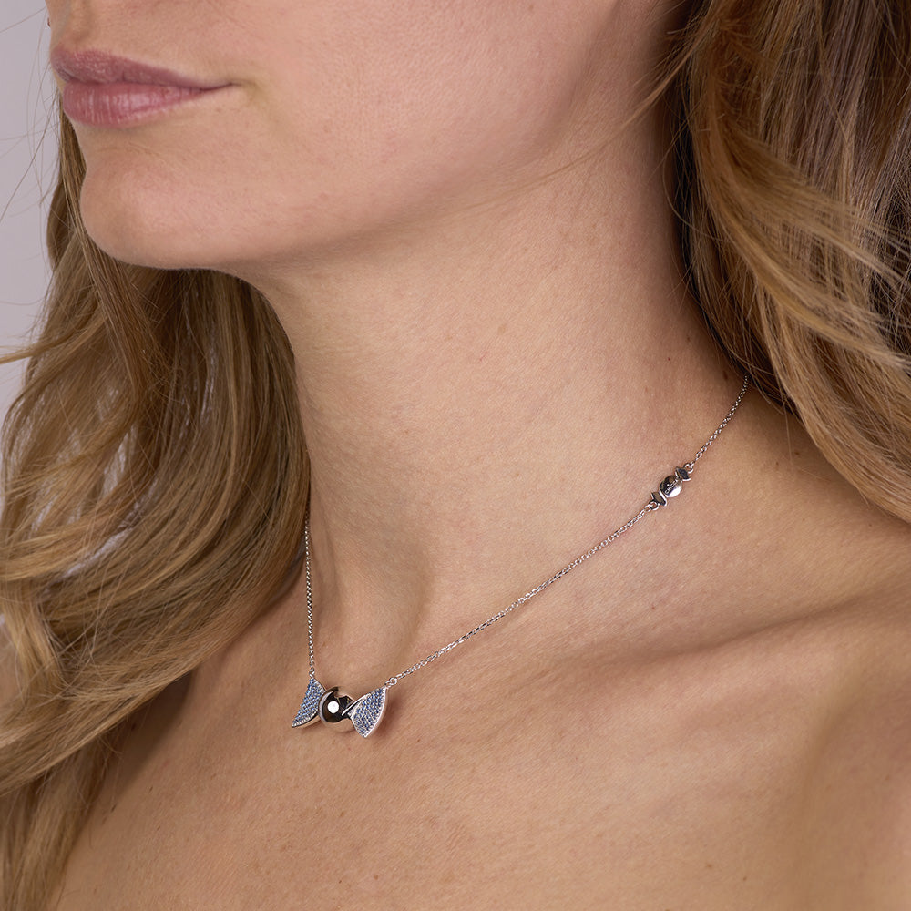 La parte centrale a forma di caramella rotonda, dalla superficie lucida, riflette la luce con armonia, mentre le alette laterali incastonate con cubic zirconia azzurri Pure Brillance Cut AAA regalano nuance fresche e luminose, evocando serenità e profondità. La catena forzatina diamantata, regolabile da 38,50 a 46,50 cm, è impreziosita da una doppia chiusura a forma di infinito in argento 925/1000, simbolo di legami eterni e indissolubili, studiata per garantire comfort, stabilità e una vestibilità impeccabile. Ogni componente è realizzato tramite microfusione, per ottenere dettagli nitidi e superfici perfette, espressione della migliore manifattura artigianale italiana di alta qualità, orgogliosamente Made in Italy.