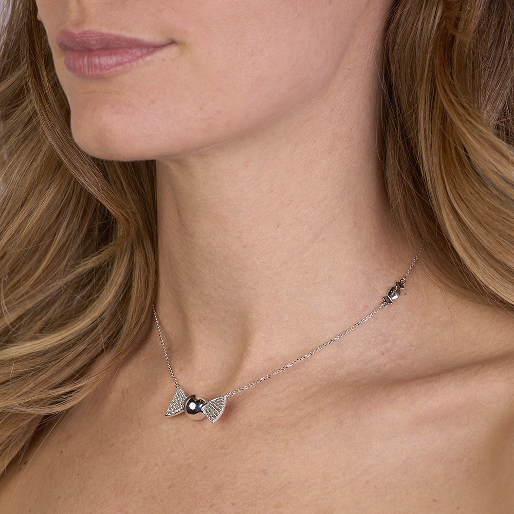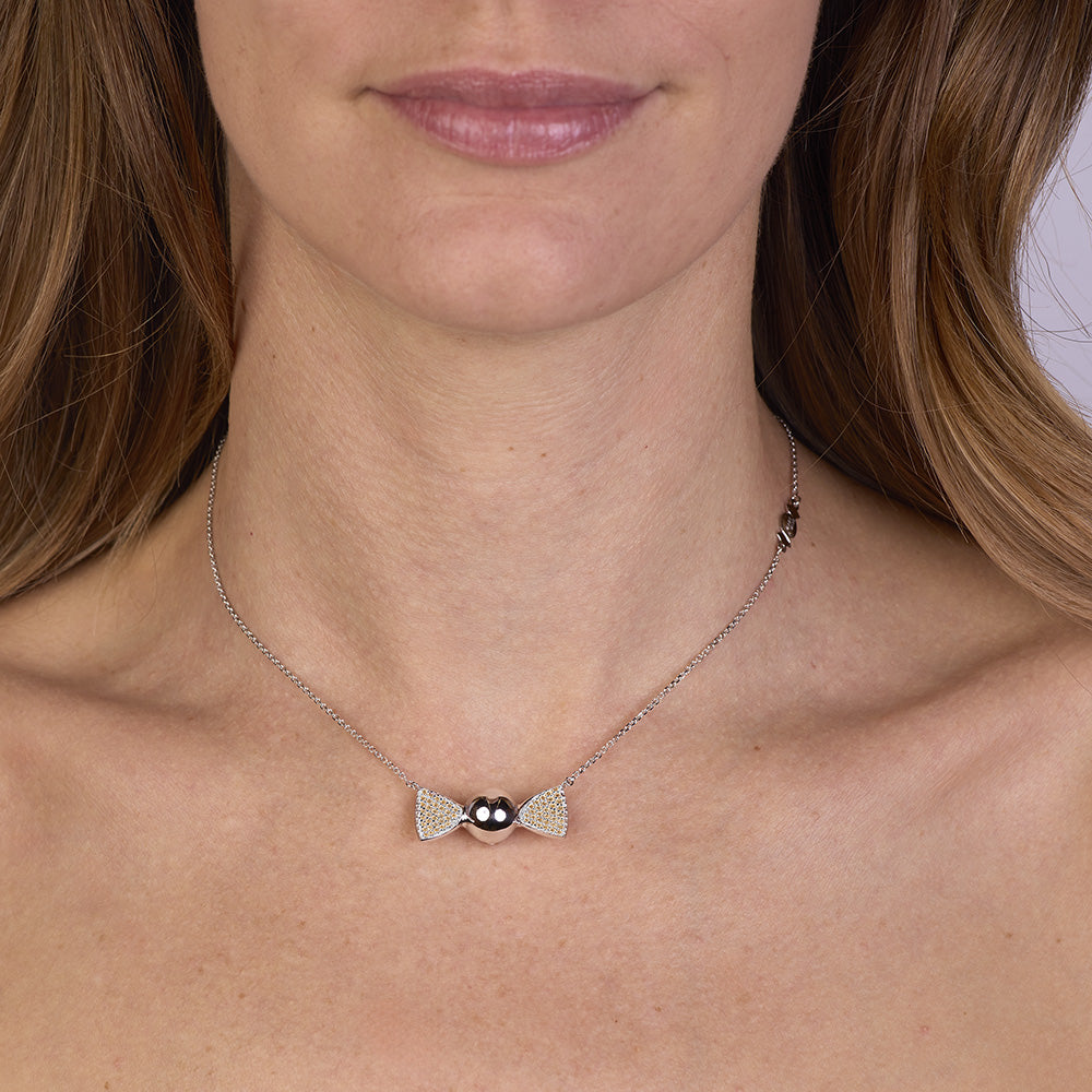 La parte centrale a forma di caramella rotonda, caratterizzata da superficie lucida, riflette la luce con una brillantezza avvolgente, mentre le alette laterali incastonate con cubic zirconia giallo paglierino Pure Brillance Cut AAA regalano giochi di luce intensi e delicati, richiamando sfumature dorate e tocchi di luce solare. La catena forzatina diamantata, regolabile da 38,50 a 46,50 cm, è arricchita da una doppia chiusura a forma di infinito in argento 925/1000, simbolo di legami eterni e indissolubili, studiata per offrire comodità, sicurezza e una vestibilità perfetta. Ogni componente è ottenuto tramite microfusione, garanzia di dettagli nitidi e forme impeccabili, espressione della migliore manifattura artigianale italiana di alta qualità, orgogliosamente Made in Italy.