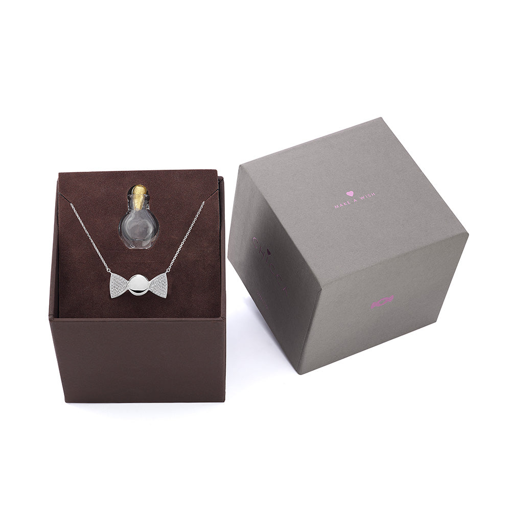 Sul retro del pendente è presente una piccola fessura, concepita per custodire il cuoricino “Make a Wish” in oro giallo 18 Kt., racchiuso in un’ampolla in vetro di Murano, realizzata a mano secondo l’antica tradizione veneziana della soffiatura del vetro. Affida a questo cuore un desiderio, una promessa o un pensiero d’amore: rimarrà protetto per sempre all’interno della tua Chicca, accompagnandoti come il più dolce dei segreti.