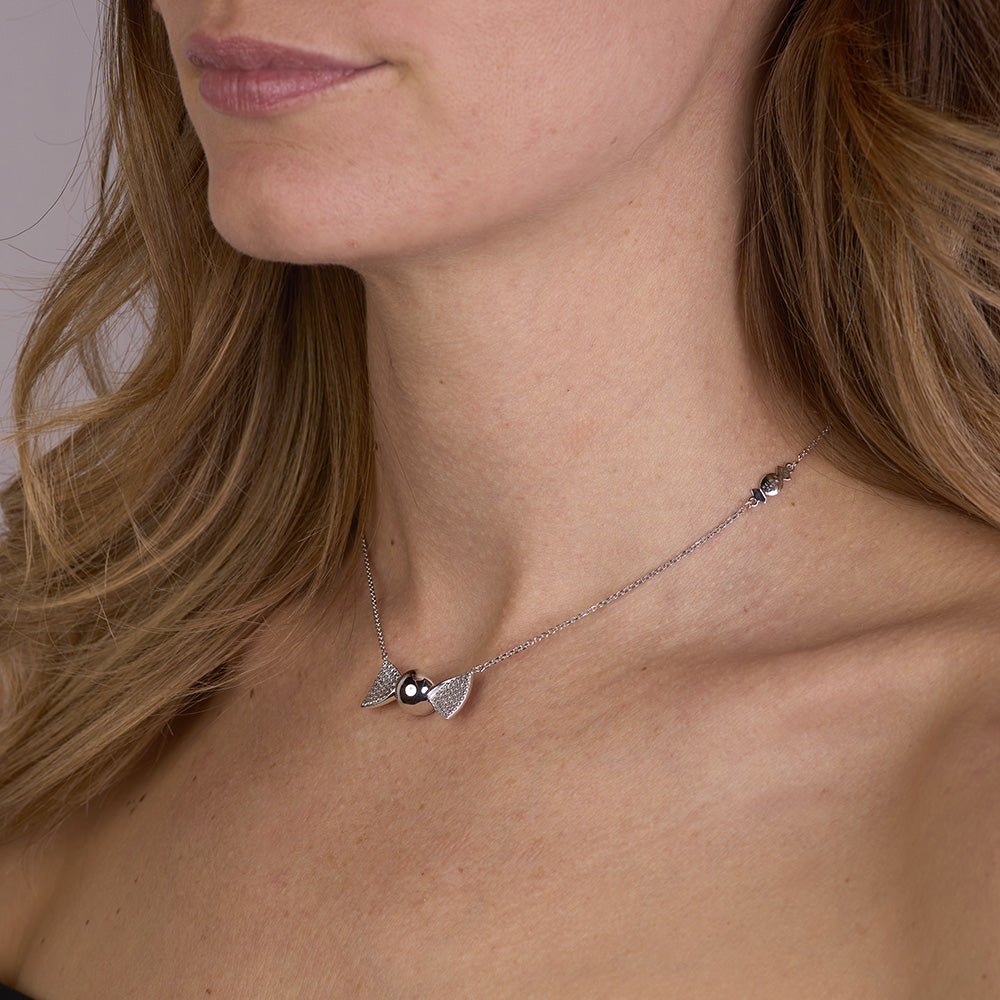 La parte centrale a forma di caramella rotonda, con superficie lucida, riflette la luce con naturale delicatezza, mentre le alette laterali incastonate con cubic zirconia bianchi Pure Brillance Cut AAA aggiungono un tocco di luminosità preziosa, paragonabile alle pietre più pregiate. La catena forzatina diamantata, regolabile da 38,50 a 46,50 cm, è impreziosita da una doppia chiusura a forma di infinito in argento 925/1000, simbolo di legami eterni e indissolubili, progettata per garantire comfort, sicurezza e una vestibilità impeccabile. Ogni dettaglio nasce dalla tecnica della microfusione, che permette forme perfette e finiture minuziose, espressione della migliore manifattura artigianale italiana di alta qualità, orgogliosamente Made in Italy.