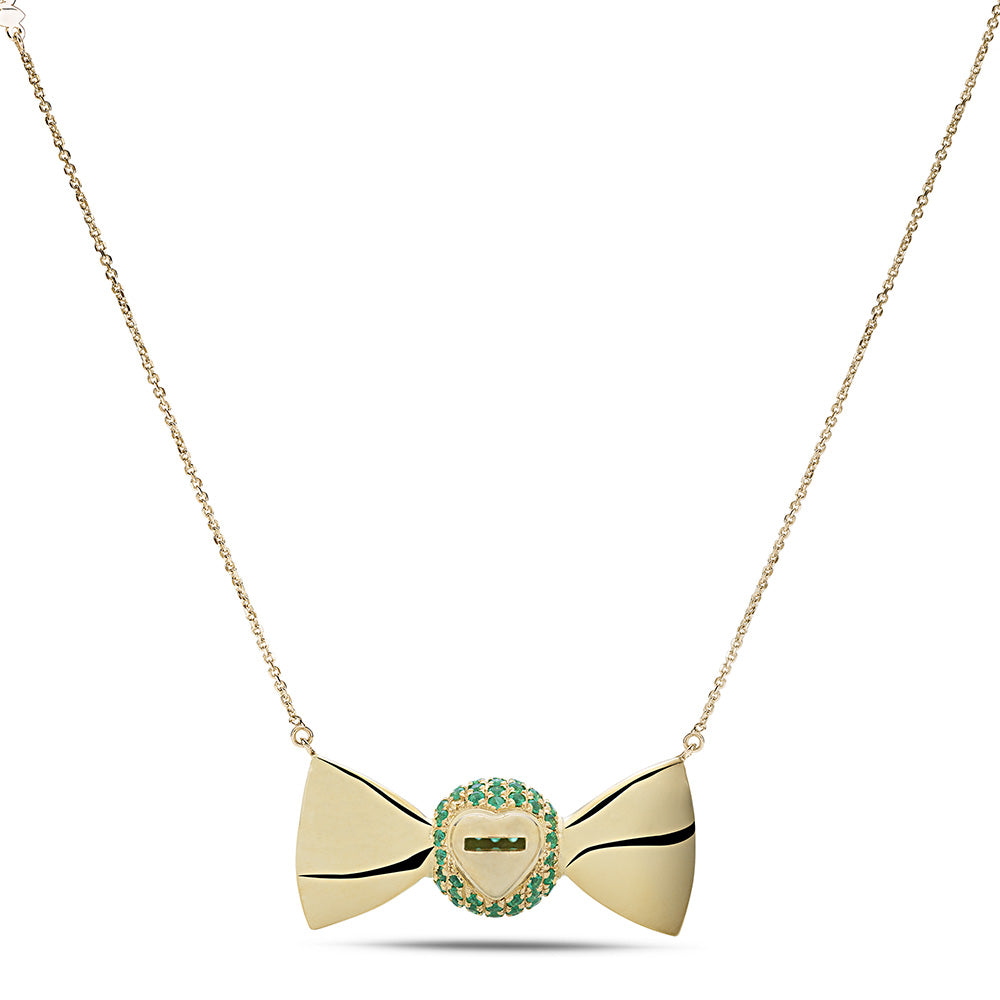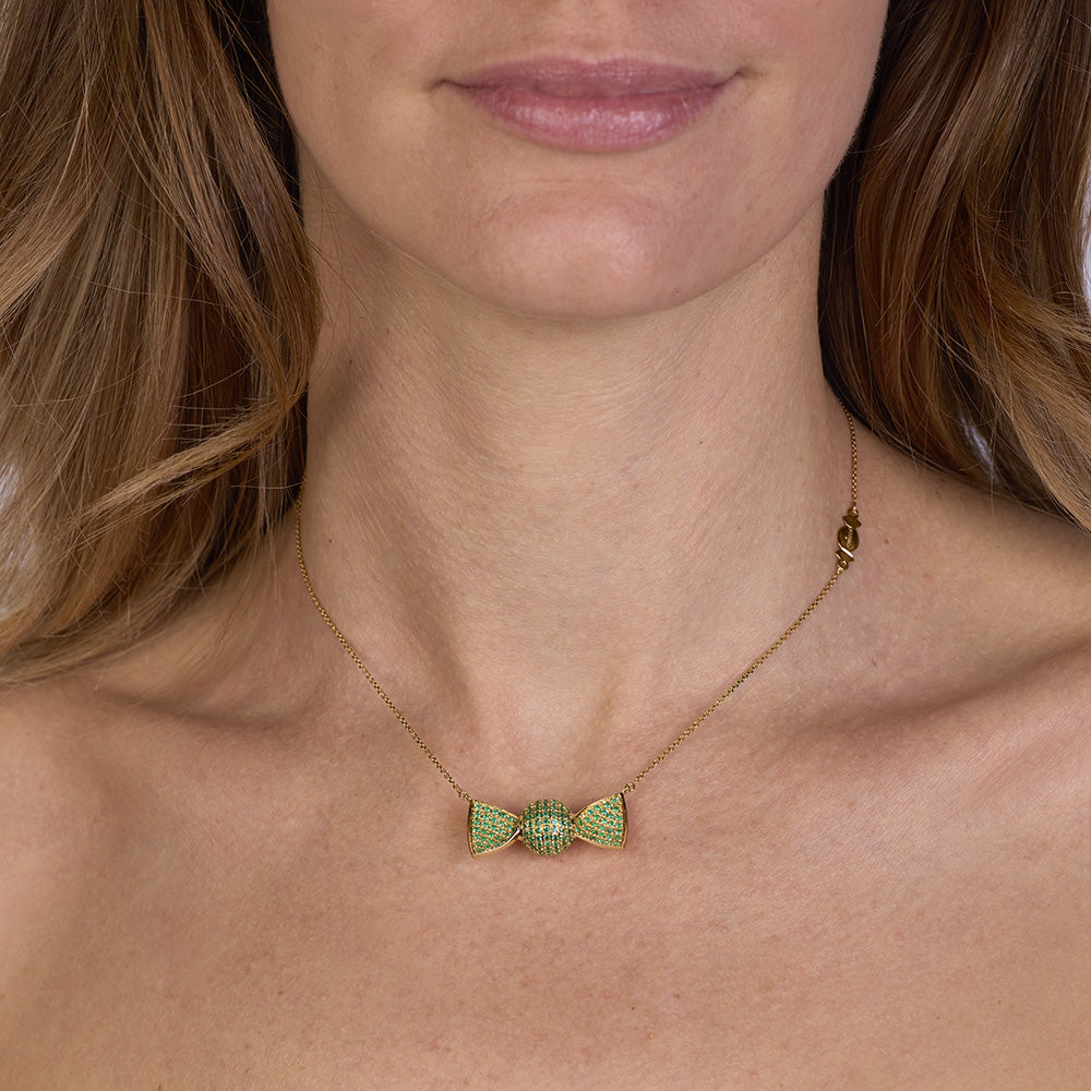 La parte centrale, dalla forma sferica a caramella, insieme alle alette frontali, è impreziosita da un’incastonatura a pavé composta da 163 smeraldi naturali taglio brillante di qualità AAA, per un totale di Ct 1,25. Il verde intenso delle pietre richiama le foreste tropicali brasiliane, simbolo di vitalità, rinascita e prosperità. La catena forzatina diamantata, regolabile da 38,50 a 46,50 cm, è completata da una doppia chiusura in oro giallo a forma di infinito, emblema di legami eterni, pensata per offrire comfort e sicurezza durante l’indosso. L’intero gioiello è ottenuto tramite microfusione, garantendo precisione, armonia e un risultato estetico impeccabile. Ogni fase produttiva rispecchia l’eccellenza della manifattura artigianale italiana, totalmente Made in Italy.