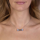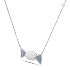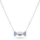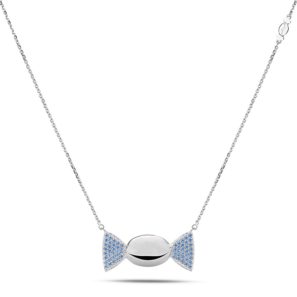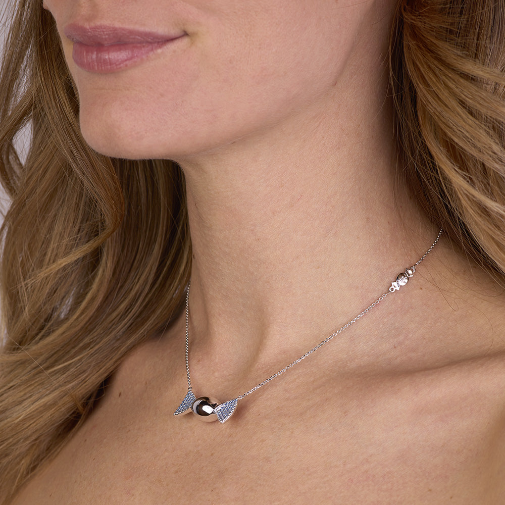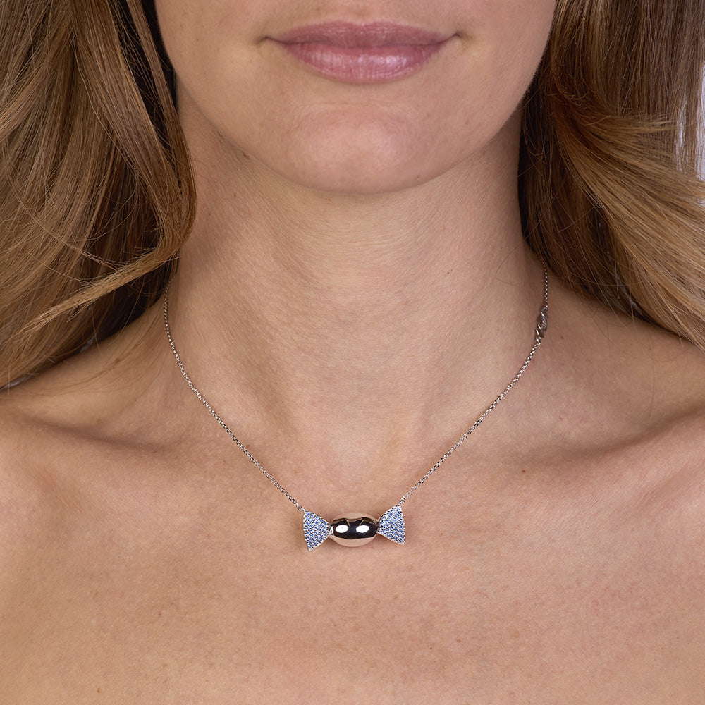 La parte centrale a forma di caramella ovale, caratterizzata da una superficie lucida, cattura la luce con una brillantezza delicata, mentre le alette laterali incastonate con cubic zirconia azzurri Pure Brillance Cut AAA regalano giochi cromatici raffinati, evocando serenità, armonia ed energia positiva. La catena forzatina diamantata, regolabile da 38,50 a 46,50 cm, è valorizzata da una doppia chiusura a forma di infinito in argento 925/1000, simbolo di legami eterni, progettata per assicurare stabilità, comfort e una vestibilità impeccabile. La produzione tramite microfusione garantisce precisione nei dettagli e finiture perfette, espressione della migliore manifattura artigianale italiana di alta qualità, orgogliosamente Made in Italy.
