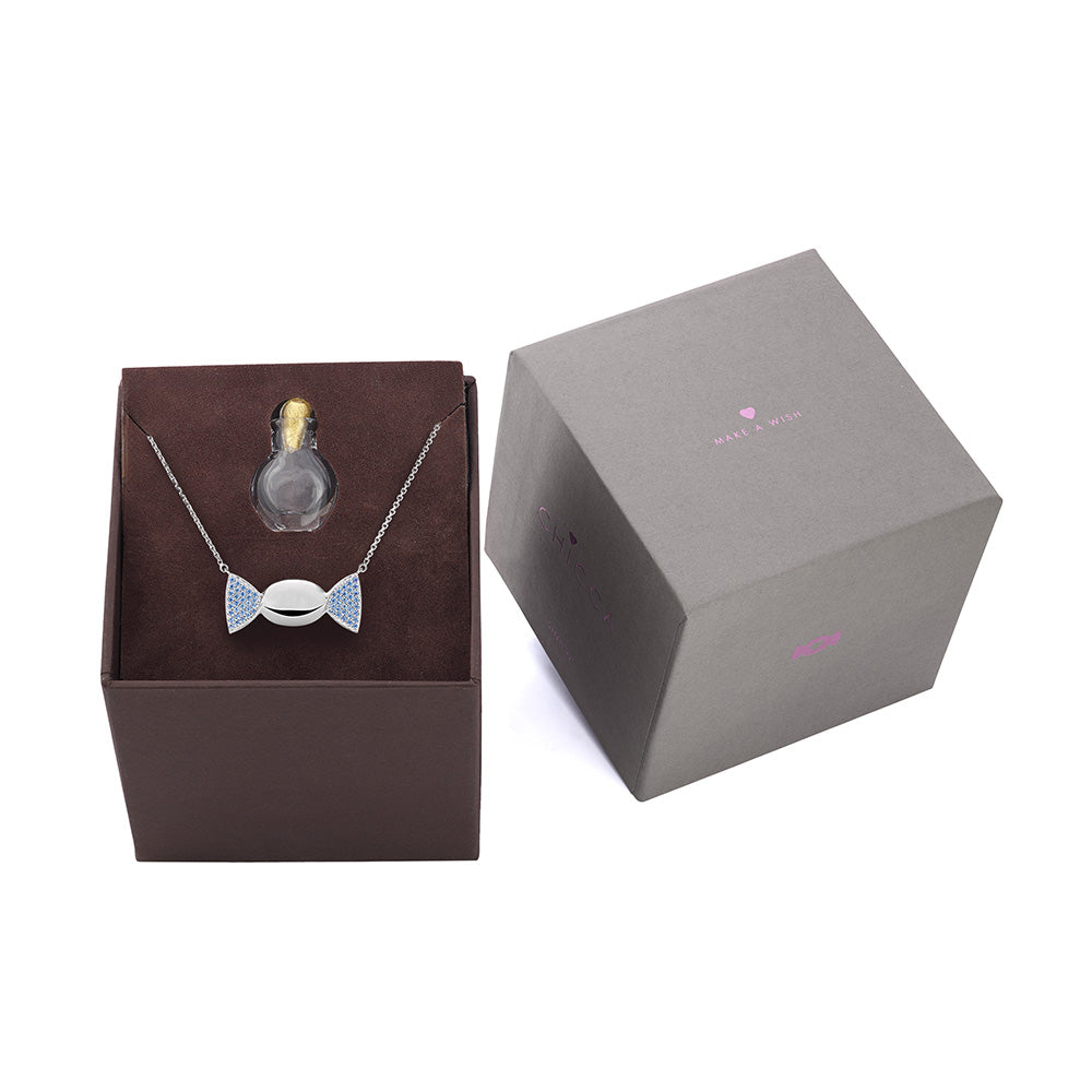 Sul retro del pendente è presente una piccola fessura che accoglie il prezioso cuoricino “Make a Wish” in oro giallo 18 Kt., custodito in un’ampolla in vetro di Murano, realizzata manualmente dai maestri vetrai veneziani con l’antica tecnica della soffiatura del vetro. A questo cuore potrai affidare desideri, promesse o pensieri d’amore: verranno custoditi per sempre all’interno della tua Chicca, come un dolce segreto da portare con te.
