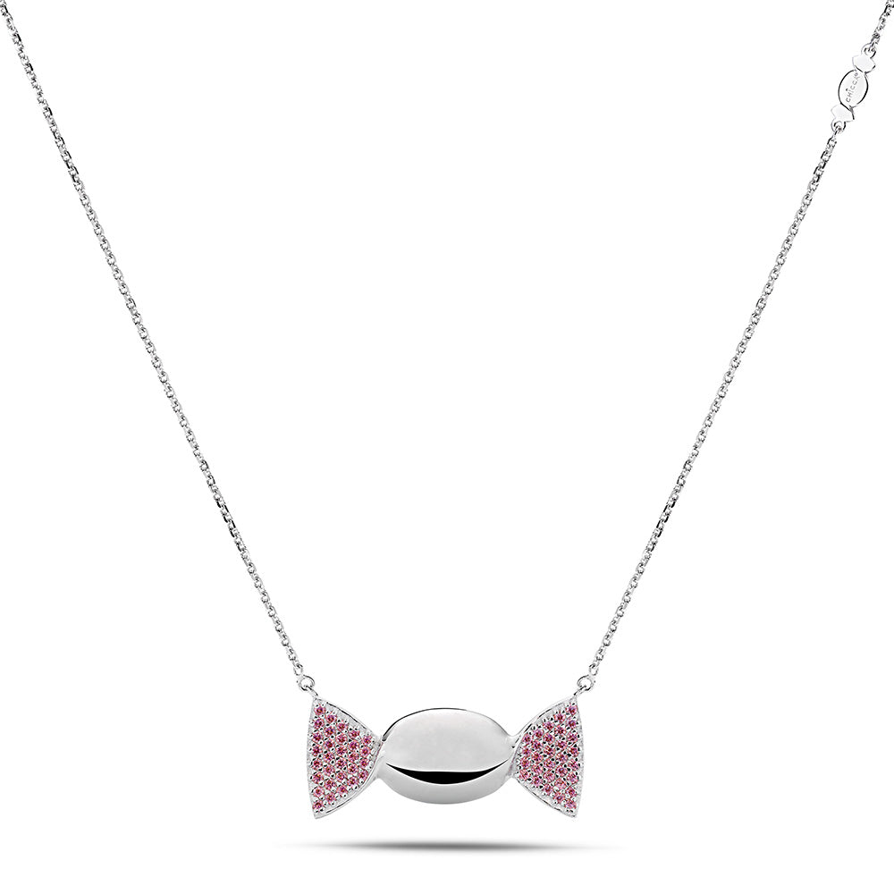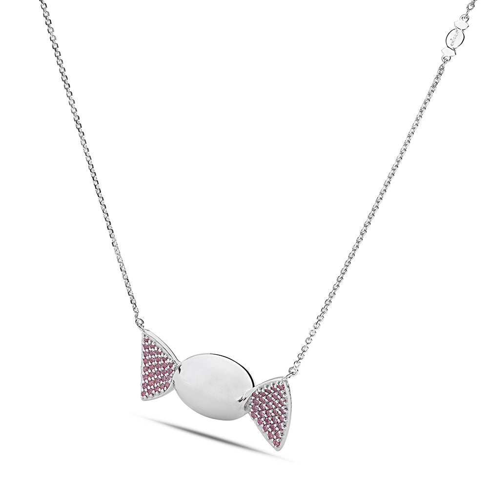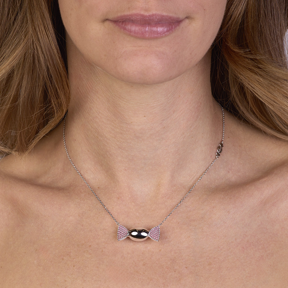 La parte centrale a forma di caramella ovale, dalla superficie lucida, cattura la luce con brillantezza raffinata, mentre le alette laterali incastonate con cubic zirconia rosa Pure Brillance Cut AAA regalano sfumature morbide e luminose, evocando dolcezza, amore e spontaneità. La catena forzatina diamantata, regolabile da 38,50 a 46,50 cm, è impreziosita da una doppia chiusura a forma di infinito in argento 925/1000, simbolo di legami eterni e indissolubili, studiata per garantire comfort, stabilità e una vestibilità impeccabile. L’intero gioiello è ottenuto tramite microfusione, tecnica che consente dettagli definiti e finiture eccellenti, espressione della migliore manifattura artigianale italiana di alta qualità, orgogliosamente Made in Italy.