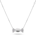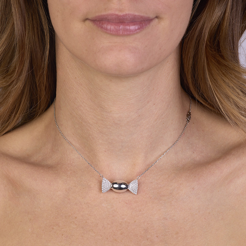 La parte centrale a forma di caramella ovale, caratterizzata da superficie lucida, illumina il décolleté con una brillantezza raffinata, mentre le alette laterali incastonate con cubic zirconia bianchi Pure Brillance Cut AAA regalano giochi di luce puliti e cristallini. La catena forzatina diamantata, regolabile da 38,50 a 46,50 cm, è impreziosita da una doppia chiusura a forma di infinito in argento 925/1000, simbolo di legami eterni e indissolubili, studiata per garantire comodità, sicurezza e una vestibilità impeccabile. L’intero gioiello è ottenuto tramite microfusione, tecnica che consente di definire i dettagli con assoluta precisione, espressione della migliore manifattura artigianale italiana di alta qualità, orgogliosamente Made in Italy.