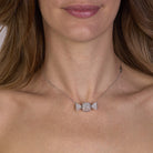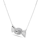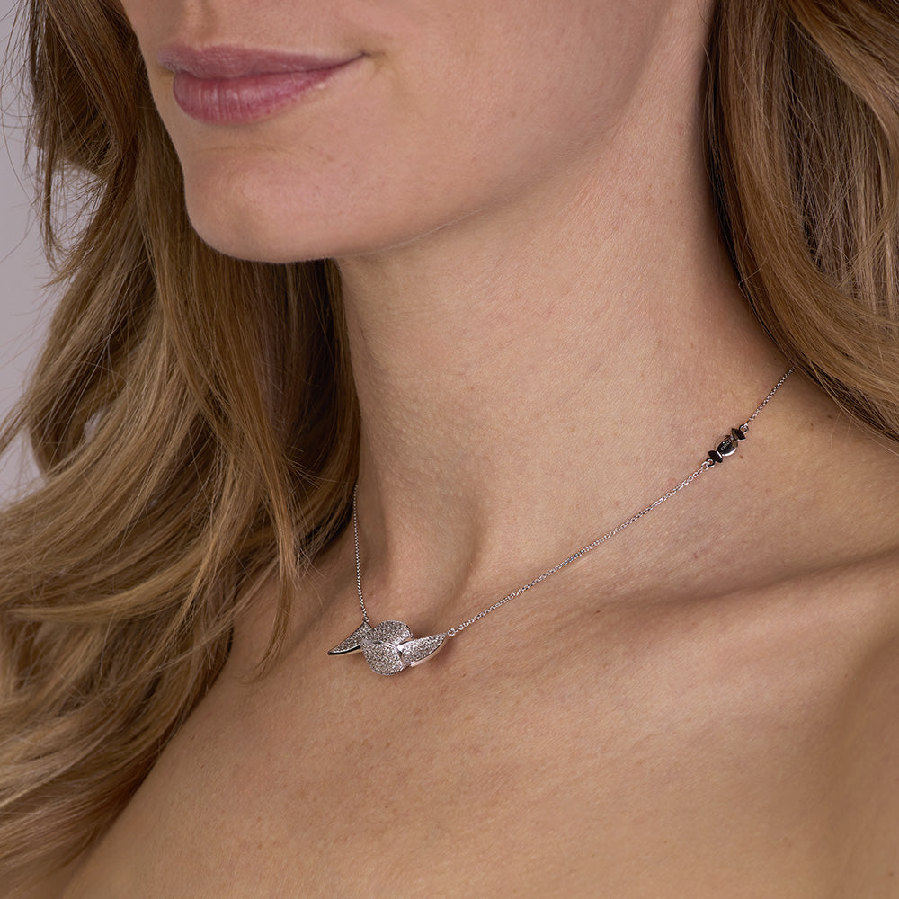 La parte centrale rettangolare e le alette frontali sono incastonate a pavé con 187 diamanti naturali taglio brillante di colore G e purezza Vs1, per un totale di Ct 1,72, creando un tappeto di riflessi ghiacciati dall’impatto luminoso eccezionale. La catena forzatina diamantata, regolabile da 38,50 a 46,50 cm, presenta una doppia chiusura a forma di infinito in oro bianco, simbolo di connessioni eterne, studiata per garantire comfort, sicurezza e vestibilità perfetta. La lavorazione tramite microfusione dona precisione millimetrica e un’estetica pulita, espressione della migliore manifattura artigianale italiana, completamente Made in Italy, con passante maglia posizionato sotto il corpo del pendente.