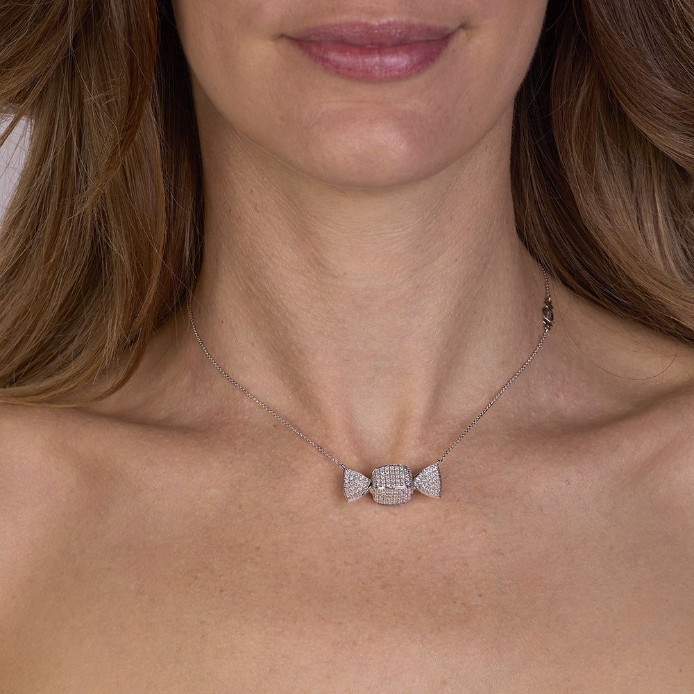 Scopri la purezza cristallina della Linea Chicca, Collezione Sugar, con la collana Polar Ice, un gioiello creato per chi desidera indossare luce, eleganza e preziosità assoluta. Realizzata in oro bianco 18 Kt., questa creazione trasforma la forma giocosa della caramella in un simbolo di ricercatezza contemporanea, perfetto per valorizzare look raffinati con una nota sofisticata e fresca.