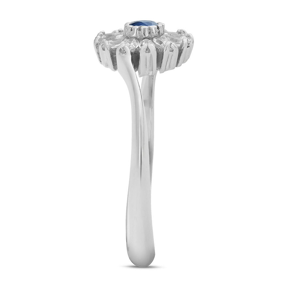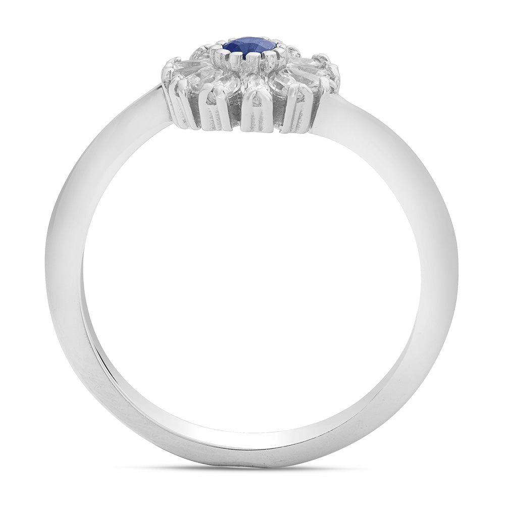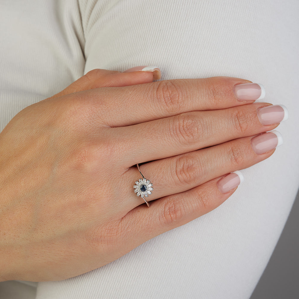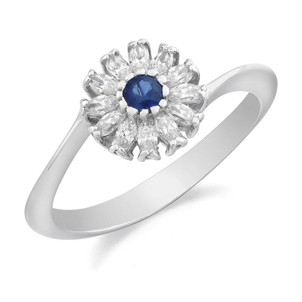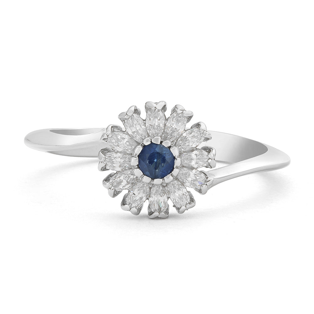 Il centrale, ispirato alla delicatezza di una margherita, è impreziosito da petali in zirconi bianchi taglio navette, che catturano la luce con straordinaria brillantezza. Il pistillo del fiore è uno splendido zaffiro blu naturale, simbolo di profondità ed eleganza, che aggiunge un tocco di colore intenso e magnetico.