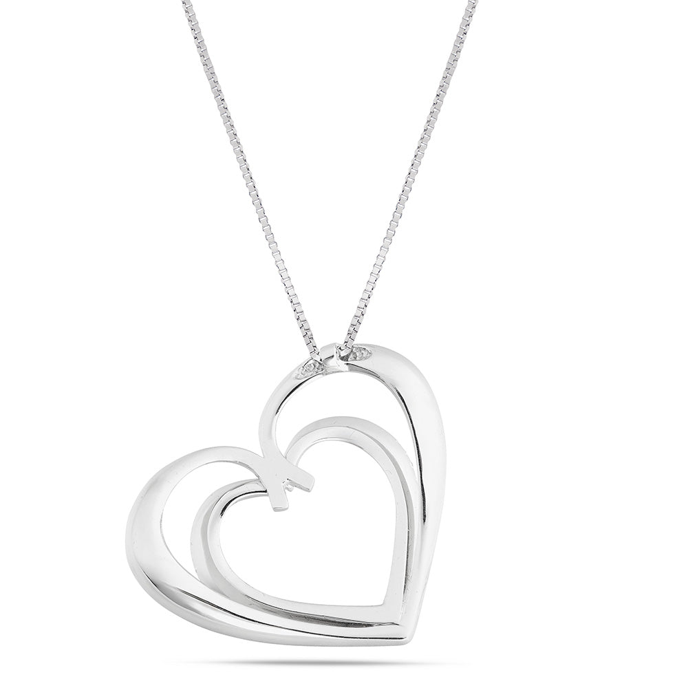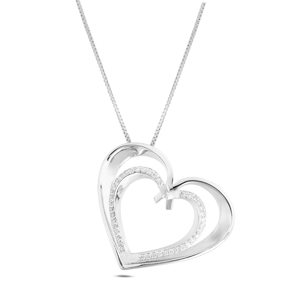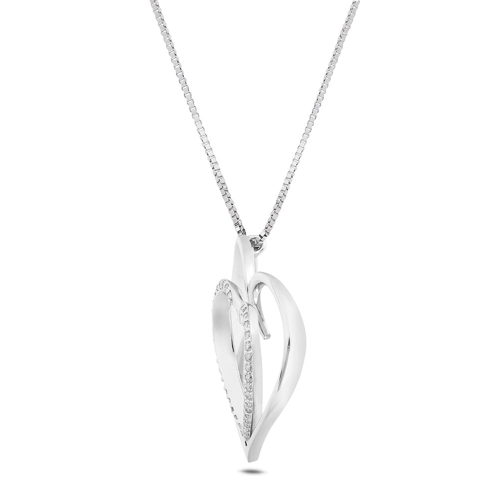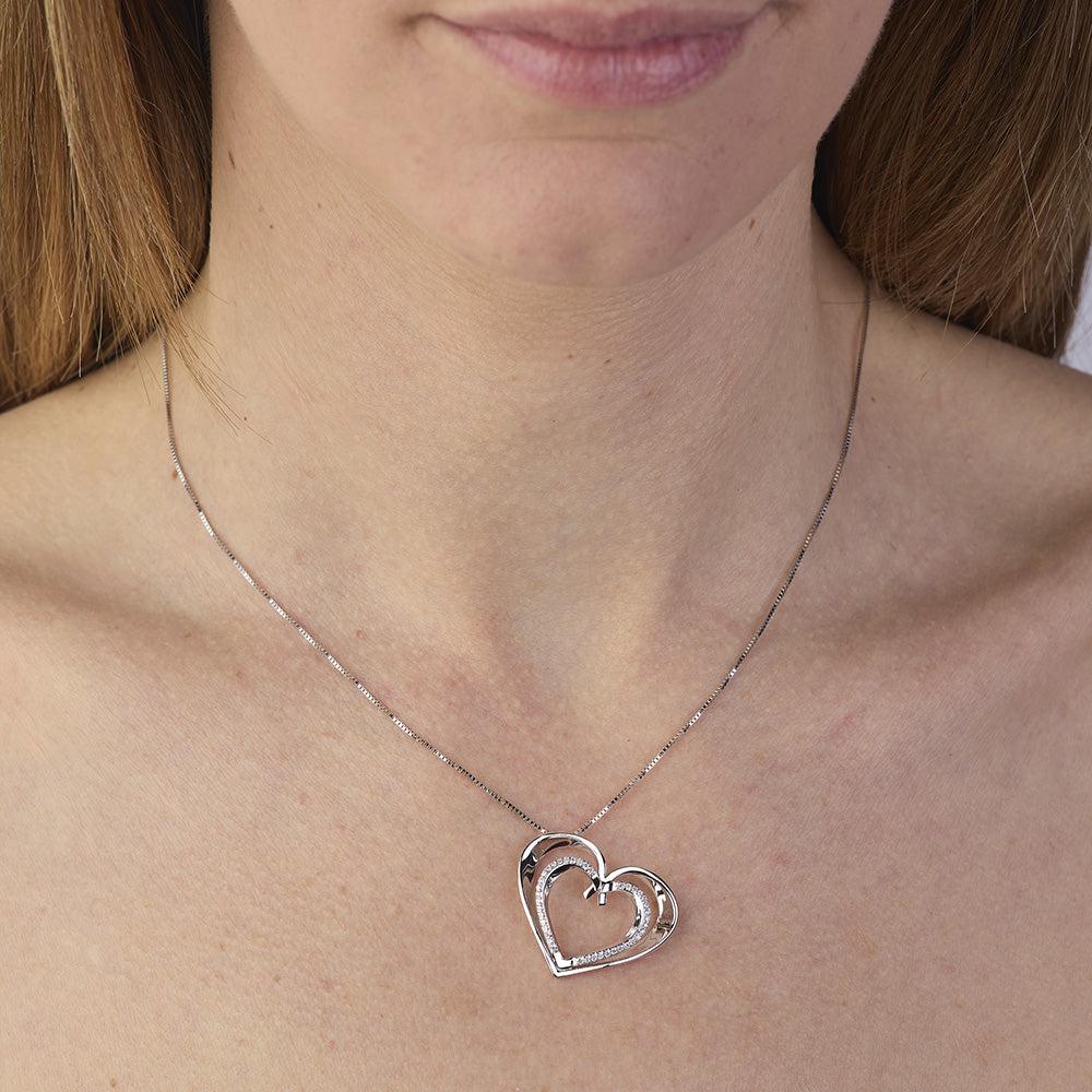 La collana presenta una delicata catena veneziana in oro bianco, che regge un ciondolo a forma di cuore dal design esclusivo. L'elemento esterno, con una finitura specchiata, incornicia un cuore più piccolo, impreziosito da 40 diamanti di Ct. 0,19, Colore G e Purezza SI1. Le gemme, incastonate con la tecnica artigianale del "filo-griffe", donano al gioiello una luminosità straordinaria, catturando ogni raggio di luce.