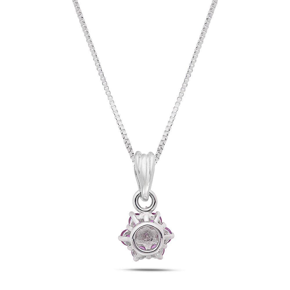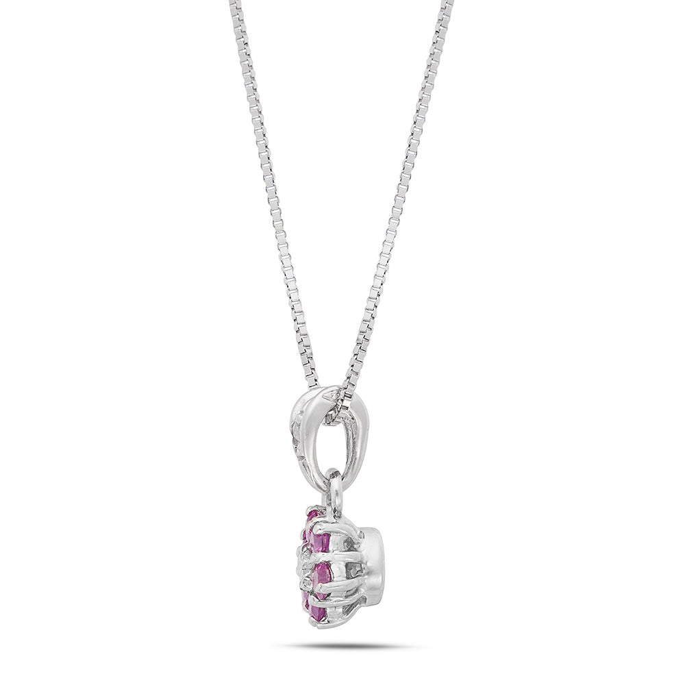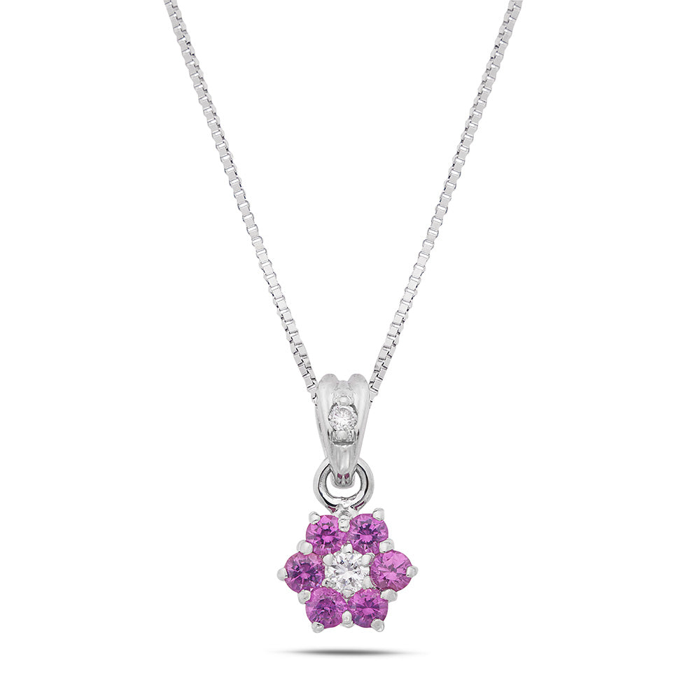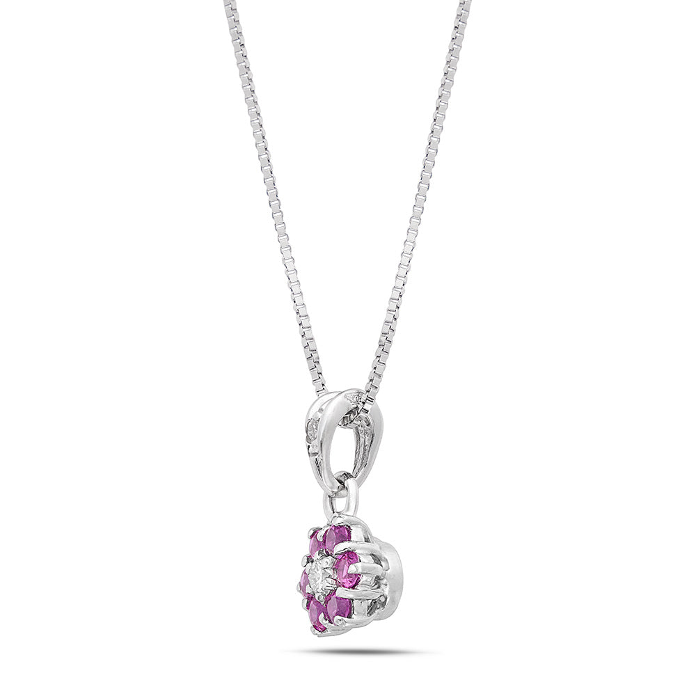 Il ciondolo è un vero capolavoro, realizzato interamente a mano mediante l'antica tecnica della microfusione. Sei rubini naturali (Ct. 0,24) formano i petali di un fiore, incastonati con la tecnica "filo-griffe" per esaltarne la luminosità. Al centro, un diamante a formare il pistillo e un altro piccolo diamante sulla contromaglia mobile aggiungono un tocco di luce, per un totale di Ct. 0,04 di colore G e purezza Vs1.