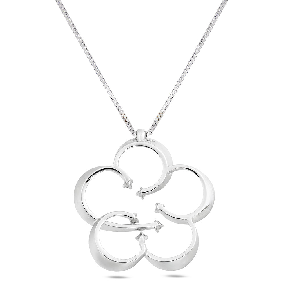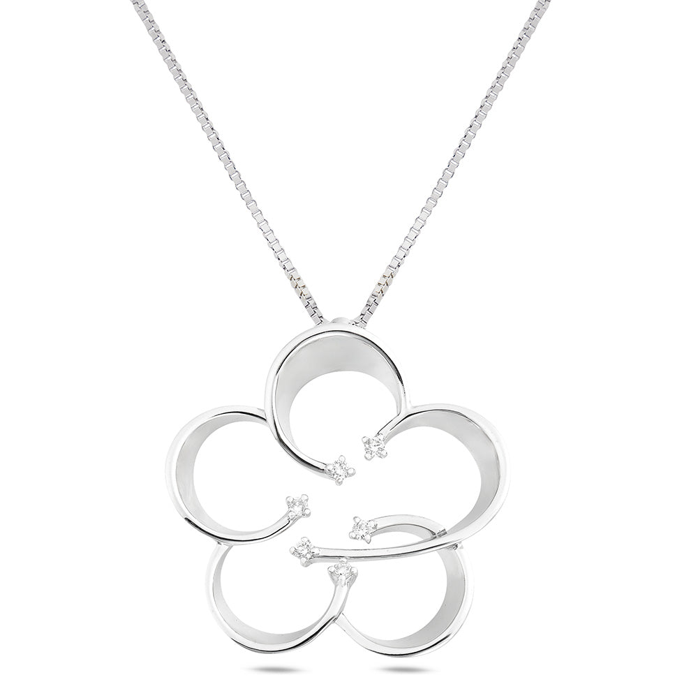 Il ciondolo, sospeso su una delicata catena veneziana in oro bianco, si presenta con un design unico: un elemento lineare e lucido che, grazie alla finitura specchiata, si trasforma in un fiore a cinque petali. Ogni petalo è impreziosito da 6 diamanti naturali posizionati alle estremità interne, per un totale di Ct. 0,09, con colore G e purezza SI1. La sofisticata tecnica di incastonatura "filo-griffe" esalta la brillantezza dei diamanti, donando al ciondolo un effetto di luce straordinario.