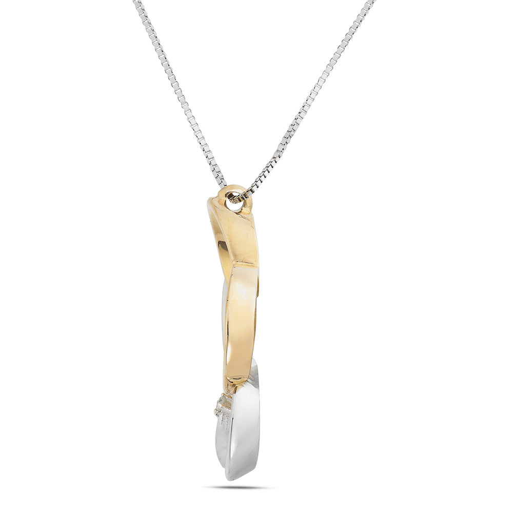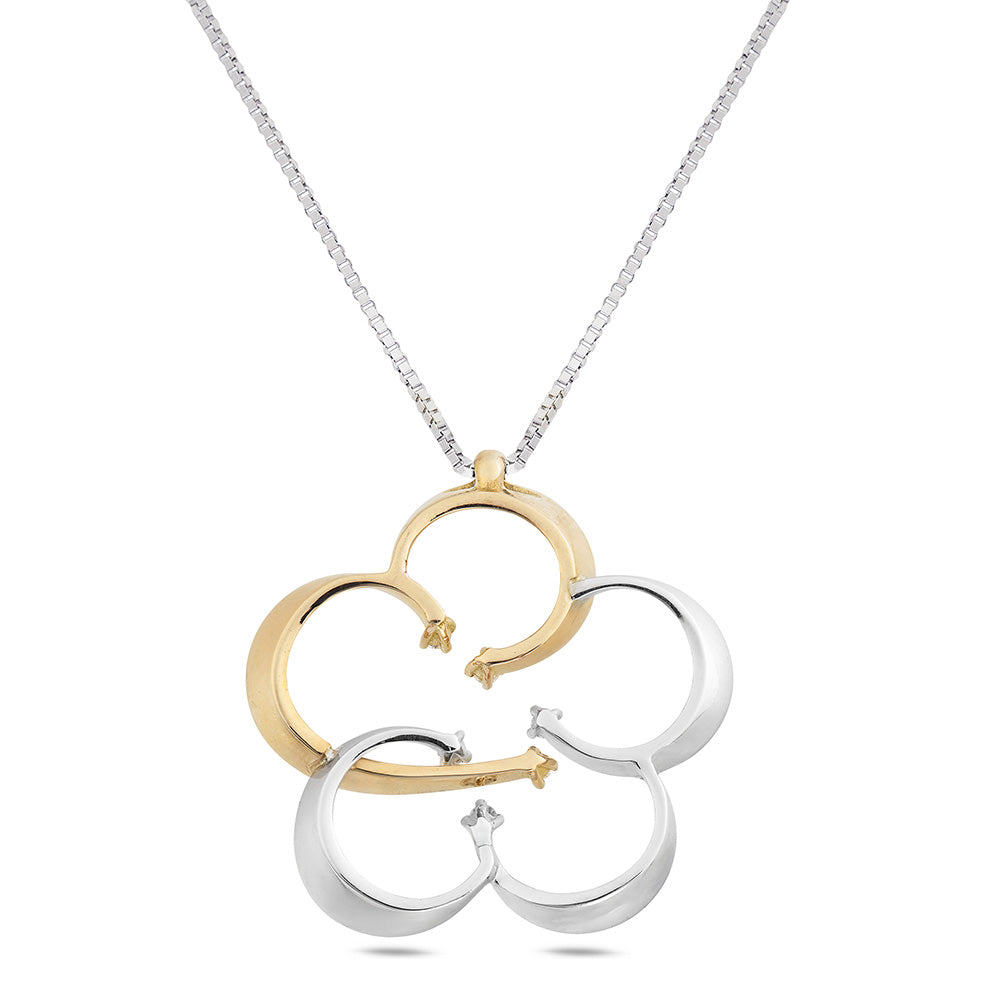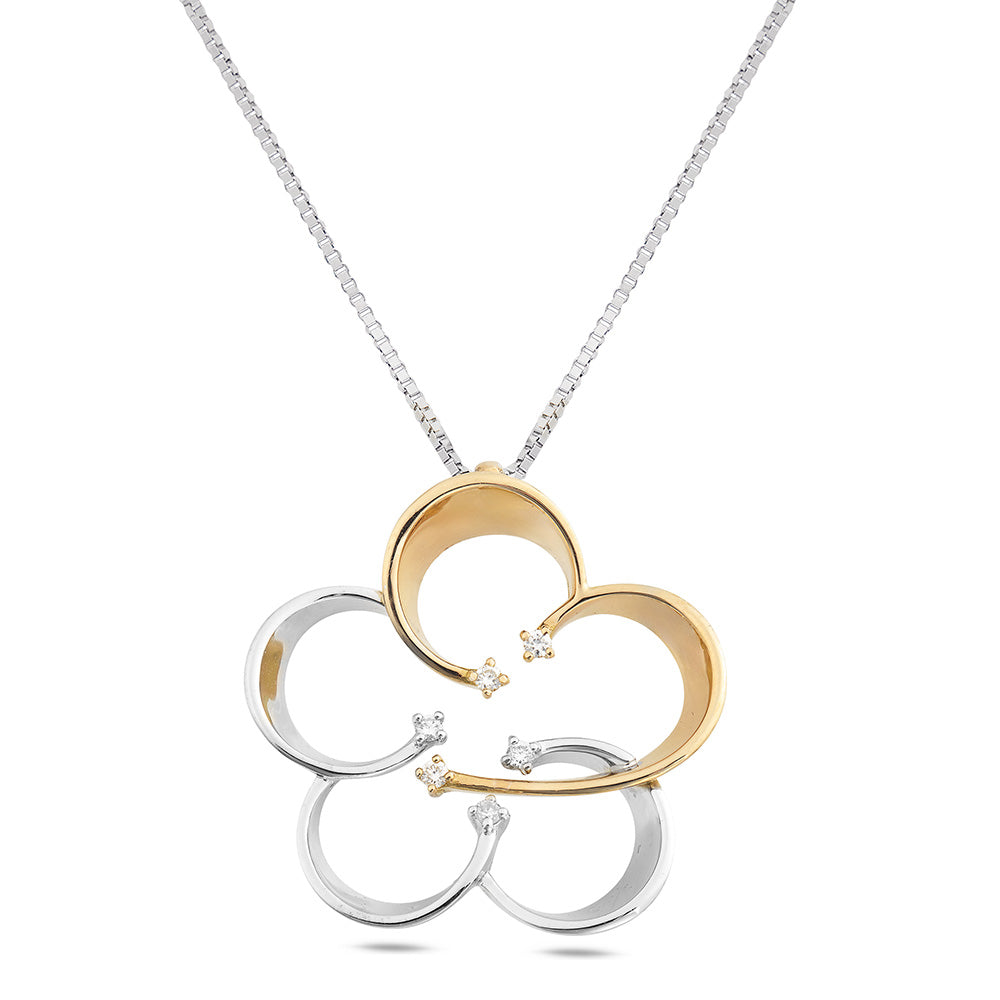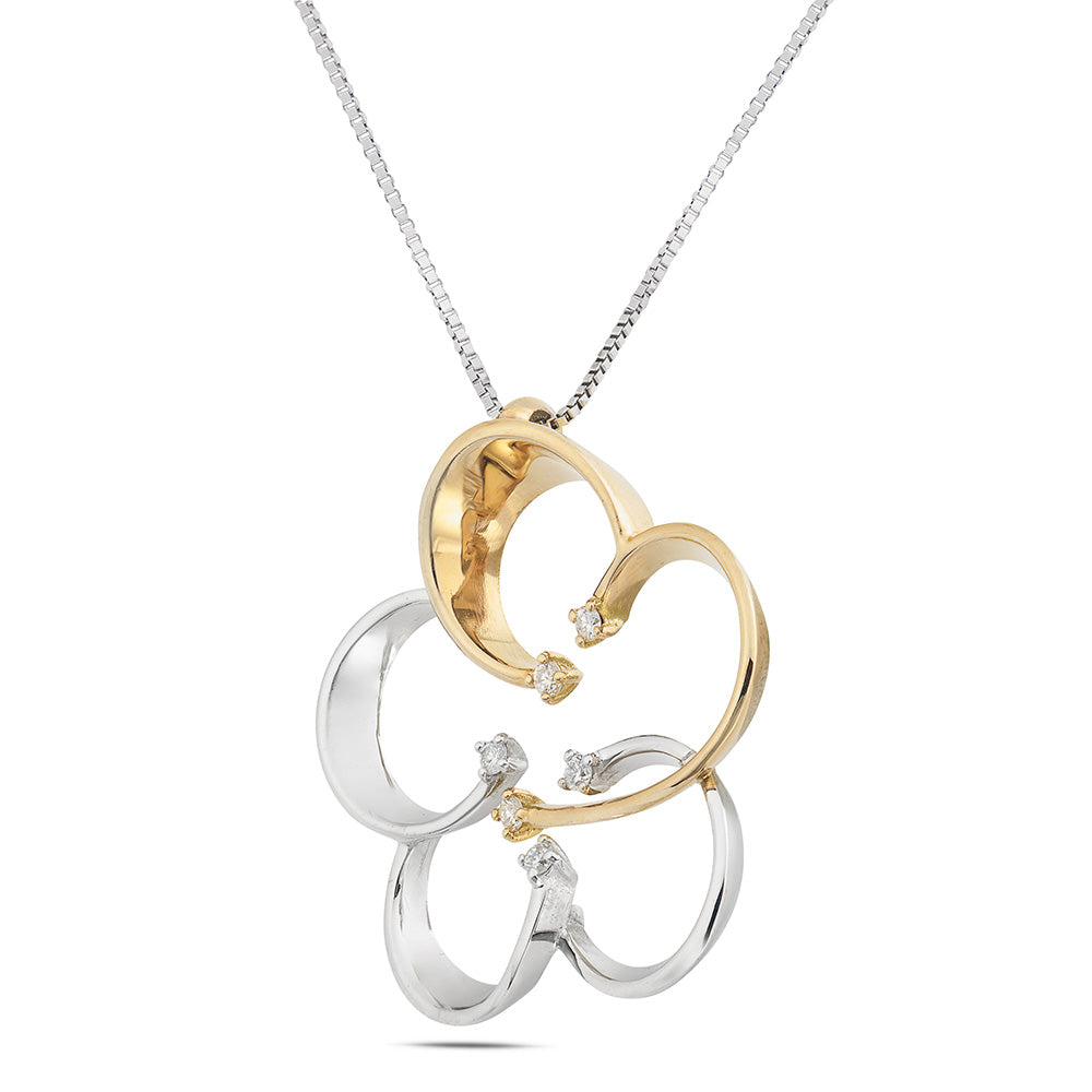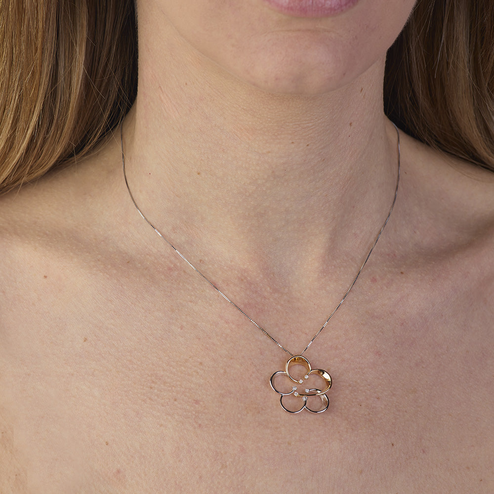 Il ciondolo, sospeso su una raffinata catena veneziana in oro bianco, si compone di due elementi distintivi: una base lineare in oro bianco specchiato e una parte superiore in oro rosa modellata a forma di cuore. Insieme, i due elementi si fondono per creare un delicato fiore a cinque petali, impreziosito da 6 diamanti naturali per un totale di Ct. 0,09, con colore G e purezza SI1. La lavorazione con la tecnica "filo-griffe" esalta la luminosità delle gemme, donando al ciondolo un fascino senza tempo.