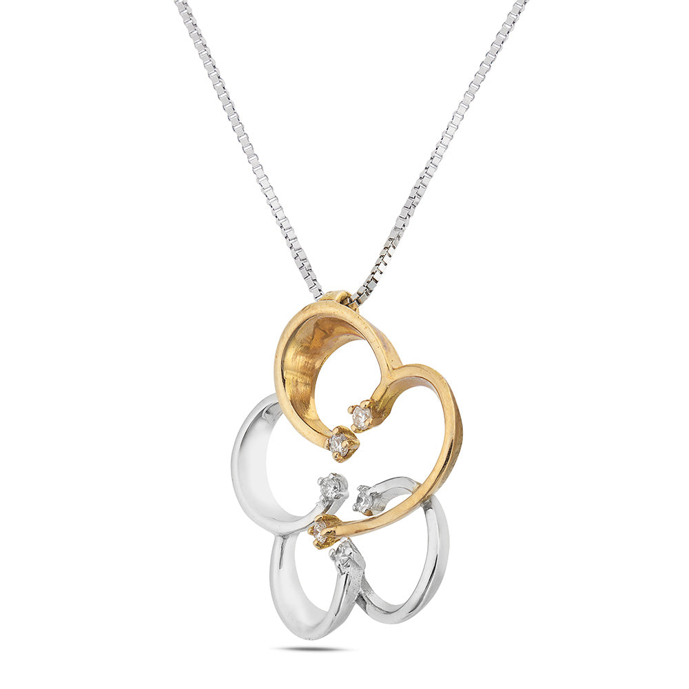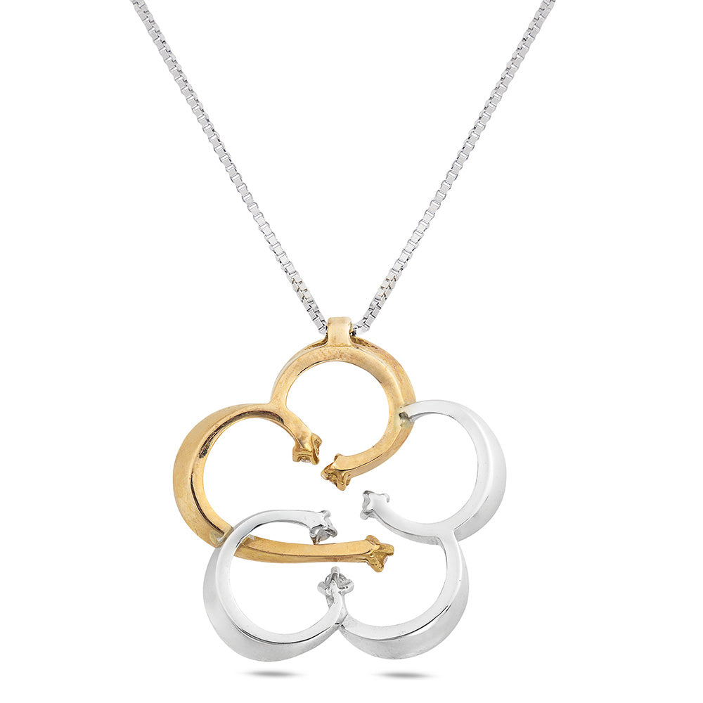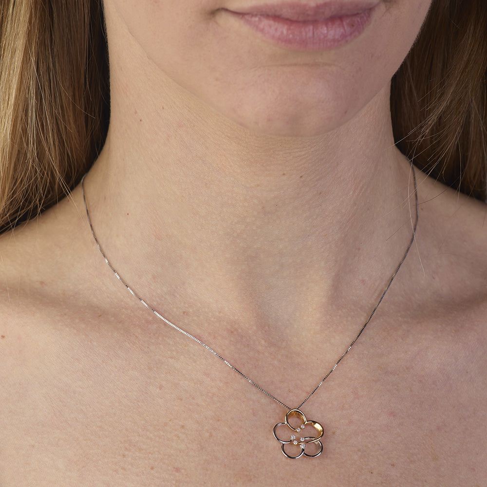 Il ciondolo, sospeso su una raffinata catena veneziana in oro bianco, si compone di due elementi distintivi: una base lineare in oro bianco specchiato e una parte superiore in oro rosa modellata a forma di cuore. Insieme, i due elementi si fondono per creare un delicato fiore a cinque petali, impreziosito da 6 diamanti naturali per un totale di Ct. 0,07, con colore G e purezza SI1. La lavorazione con la tecnica "filo-griffe" esalta la luminosità delle gemme, donando al ciondolo un fascino senza tempo.
