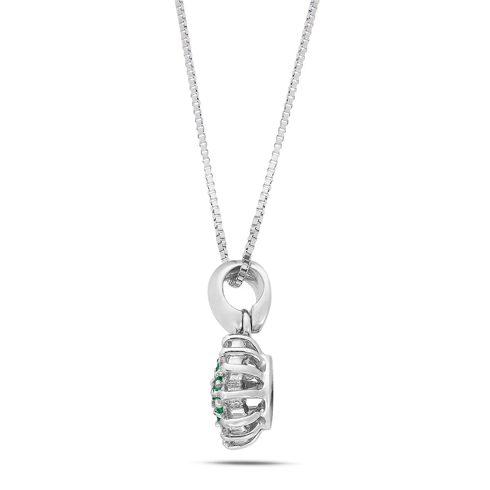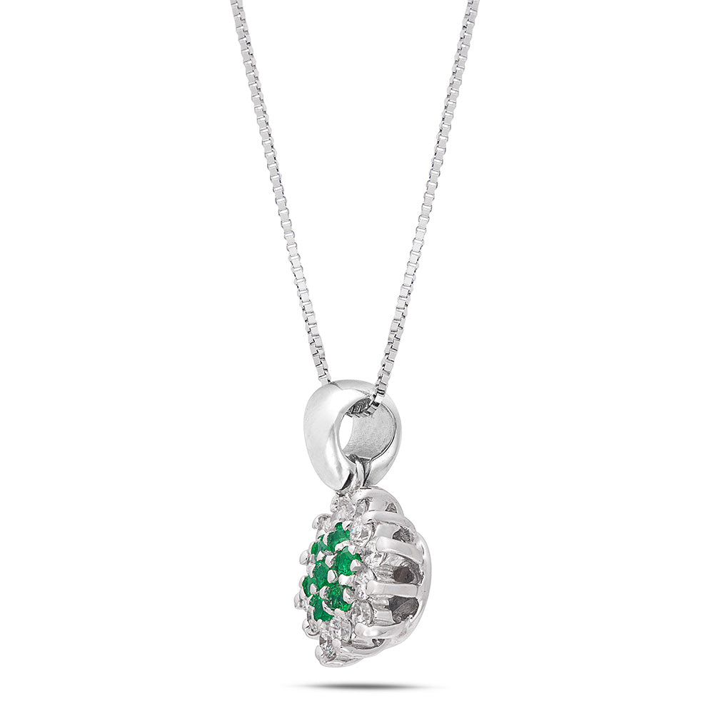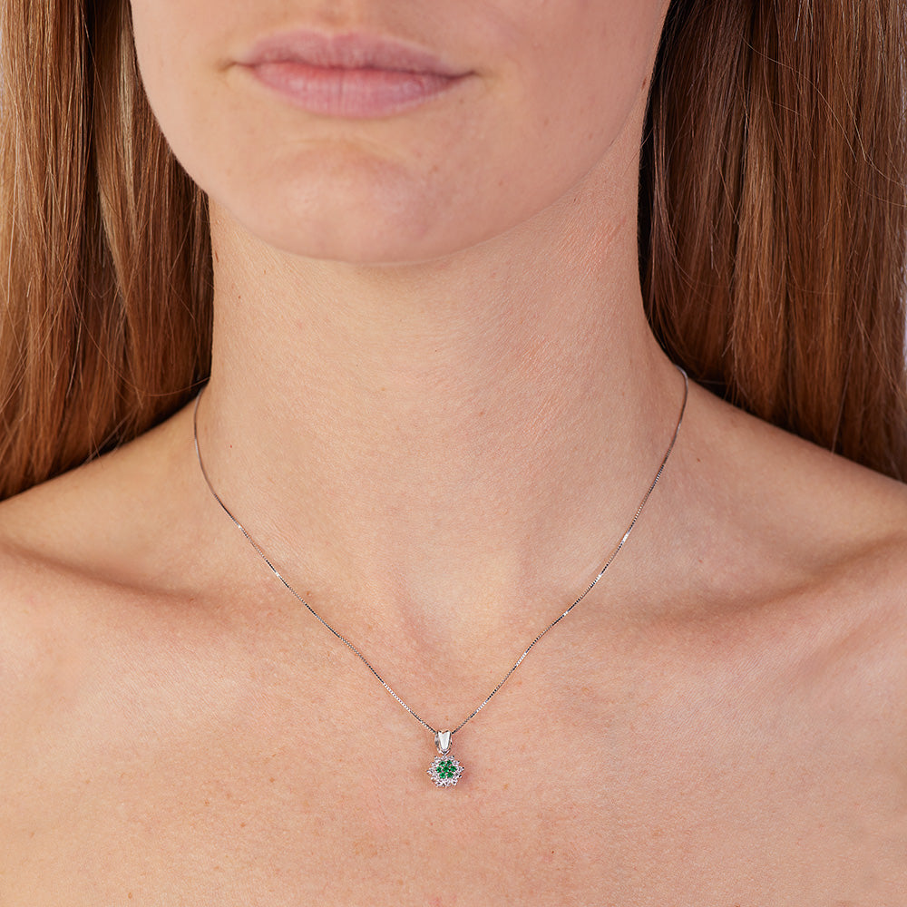 Il ciondolo, realizzato a mano mediante l'antica tecnica della microfusione, è composto da 12 diamanti (ct. 0,20, colore G, purezza Vs1) che formano i petali di un fiore, incastonati con la tecnica "filo-griffe" per esaltarne la brillantezza. Al centro, 7 smeraldi naturali (ct. 0,10) compongono il pistillo, aggiungendo un tocco di verde intenso. La contromaglia mobile lucida dona un movimento elegante al design.