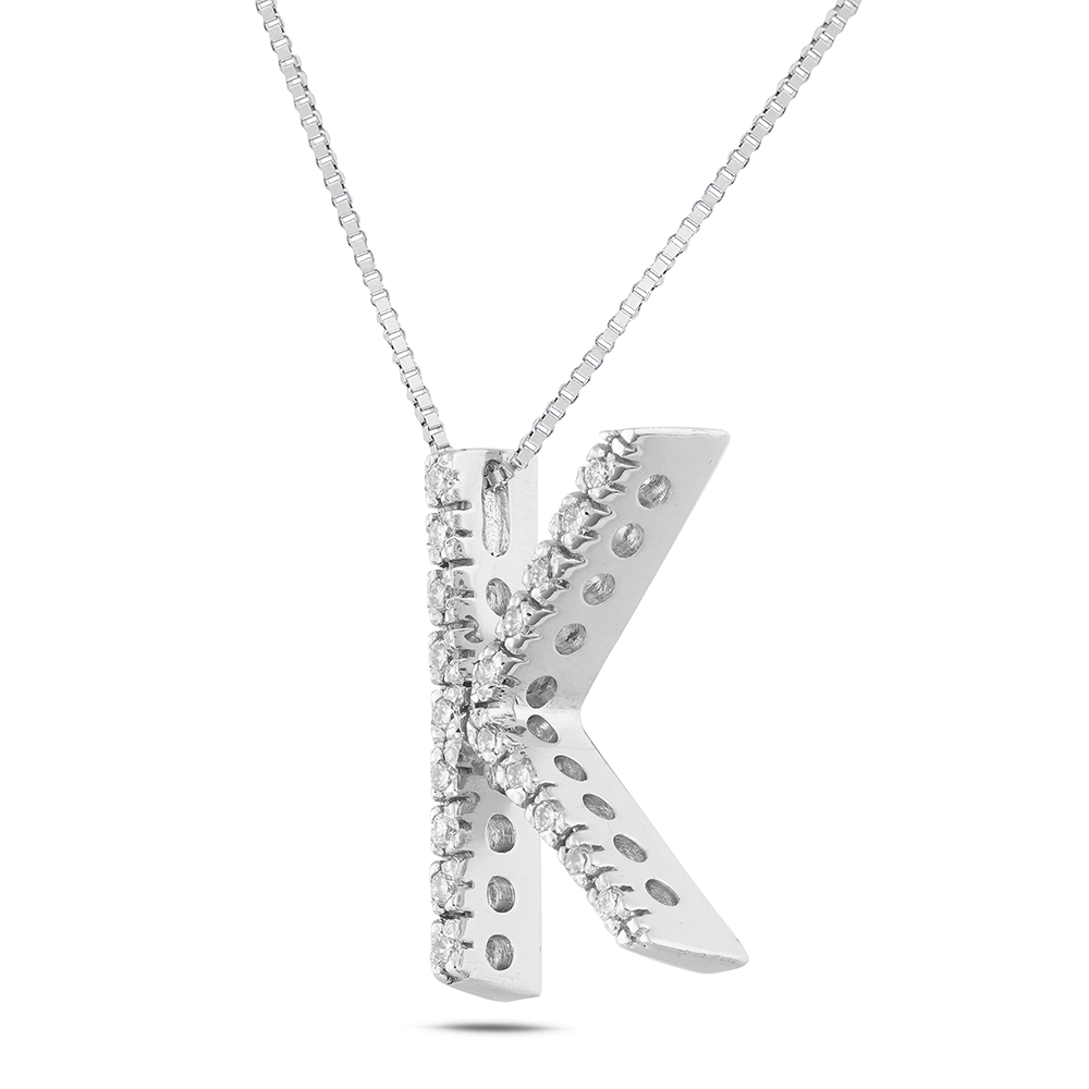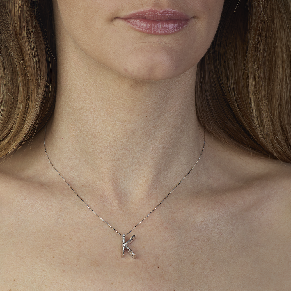 Un gioiello dal fascino senza tempo, la Collana in oro bianco 18 Kt. della Collezione "Letters" incarna stile, eleganza e unicità. Il ciondolo a forma di lettera "K" è impreziosito da 19 diamanti naturali, per un totale di Ct. 0,13, accuratamente selezionati nel loro Colore G e Purezza VS1, a garanzia di una luminosità straordinaria.