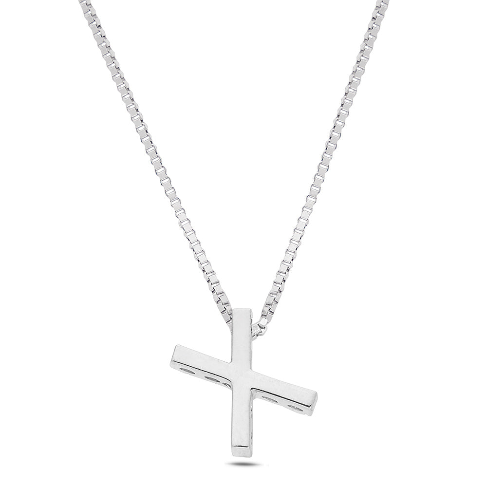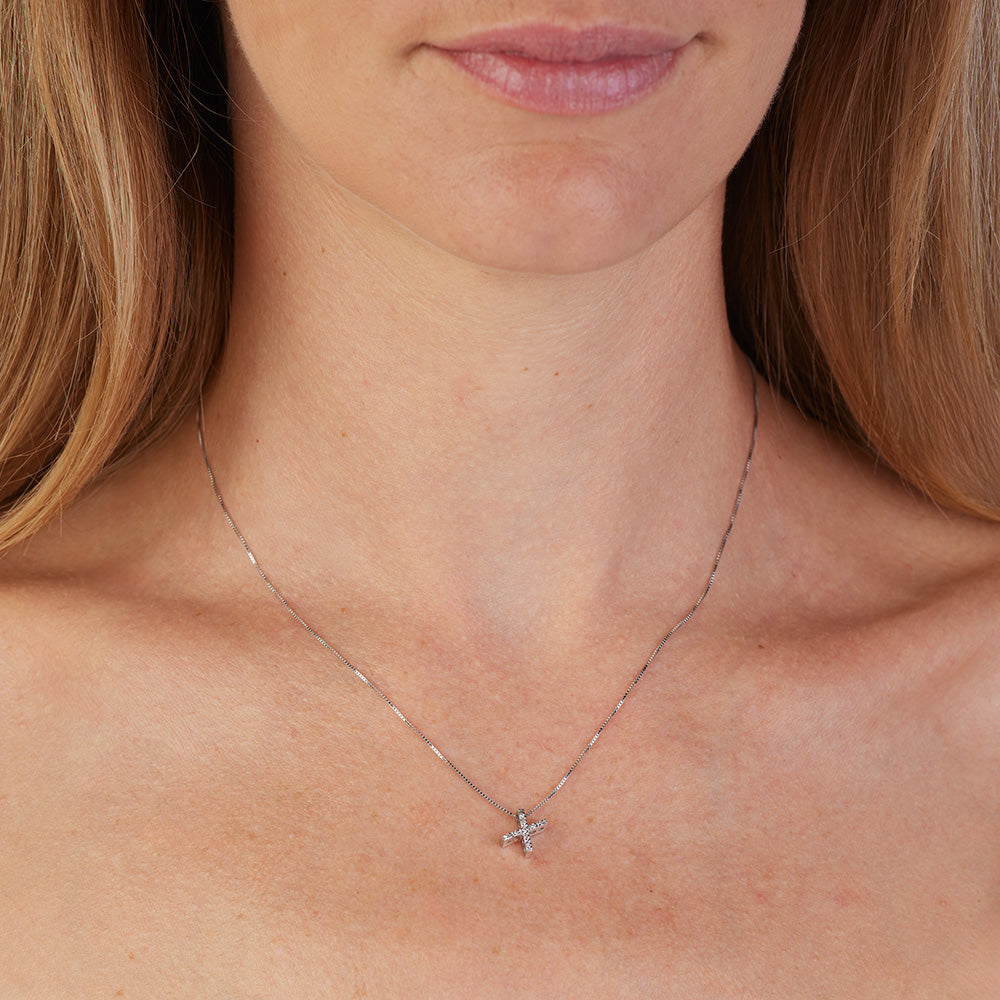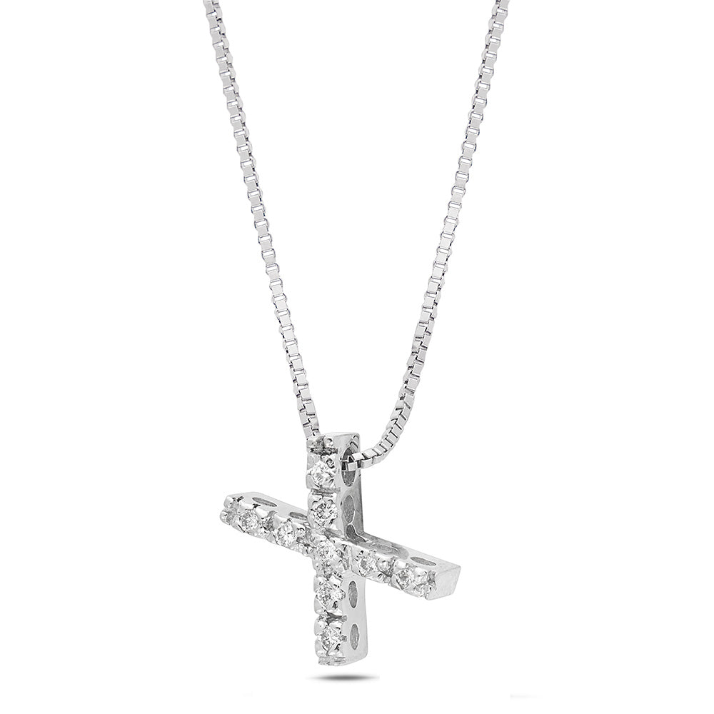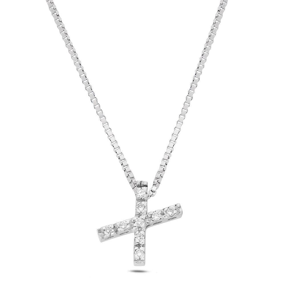 Dalla collezione "Letters", la nostra collana in oro bianco da 18 Kt. rappresenta un gioiello unico e senza tempo. Il ciondolo, a forma di lettera "X", è impreziosito da 9 diamanti, del peso complessivo di Ct. 0,06, con colore G e purezza Vs1, incastonati con la tecnica a filo-griffe, che dona eleganza e raffinatezza senza compromettere la sicurezza delle pietre.