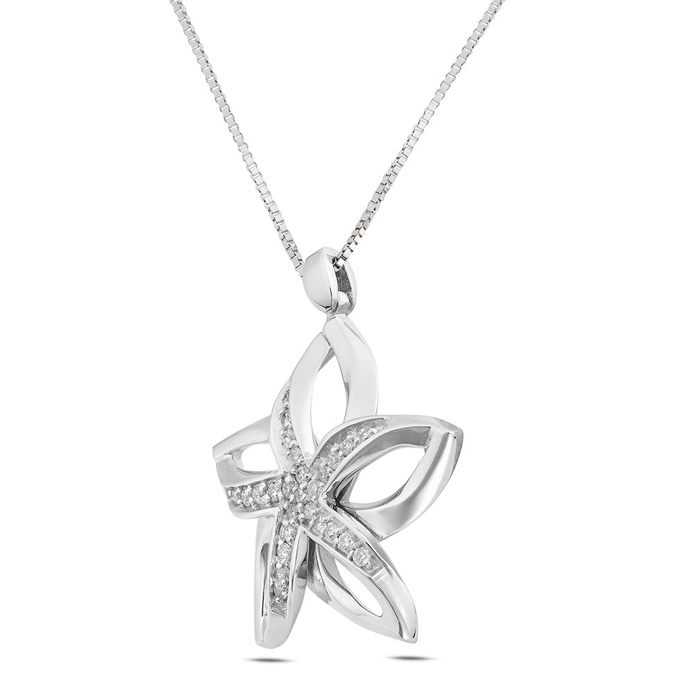 Il ciondolo, sorretto da una delicata catena veneziana in oro bianco, è composto da due livelli che creano un equilibrio perfetto tra semplicità e ricchezza. La base presenta un elemento lineare e lucido, mentre la parte superiore è dominata da una luminosa stella marina a cinque punte, simbolo di rigenerazione e guida. La stella è impreziosita da 26 diamanti naturali per un totale di Ct. 0,20, con colore G e purezza SI1, incastonati con la tecnica "filo-griffe" per valorizzarne la brillantezza.