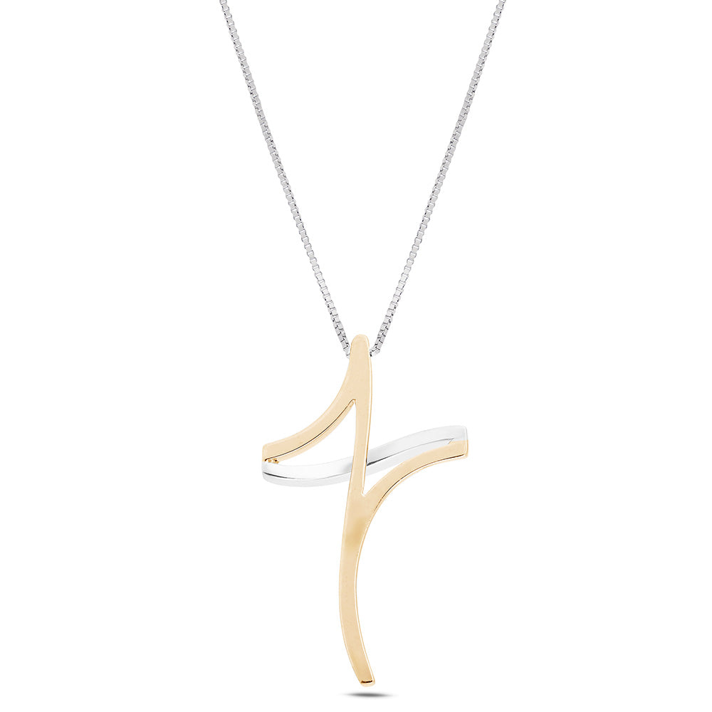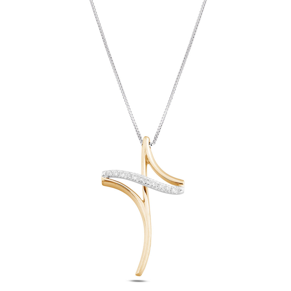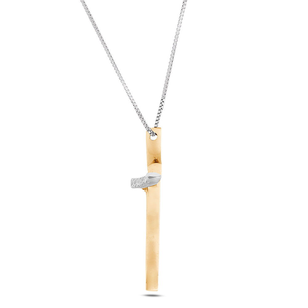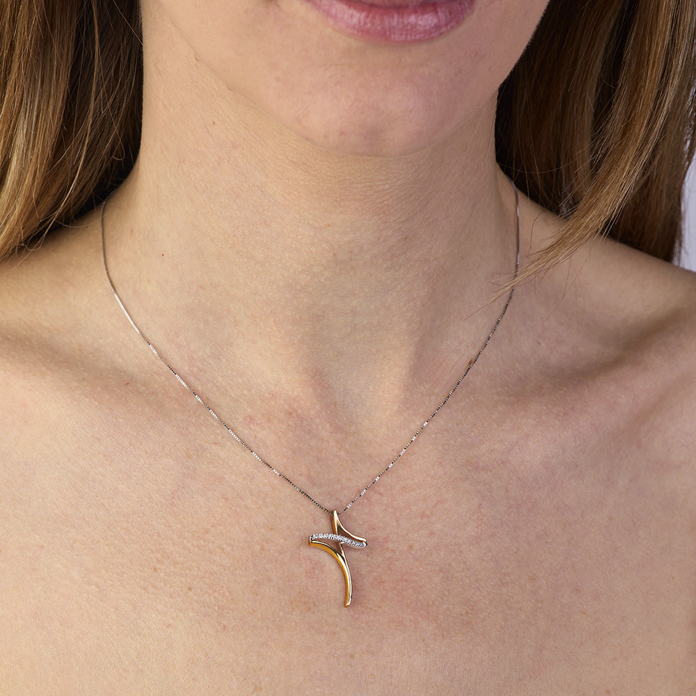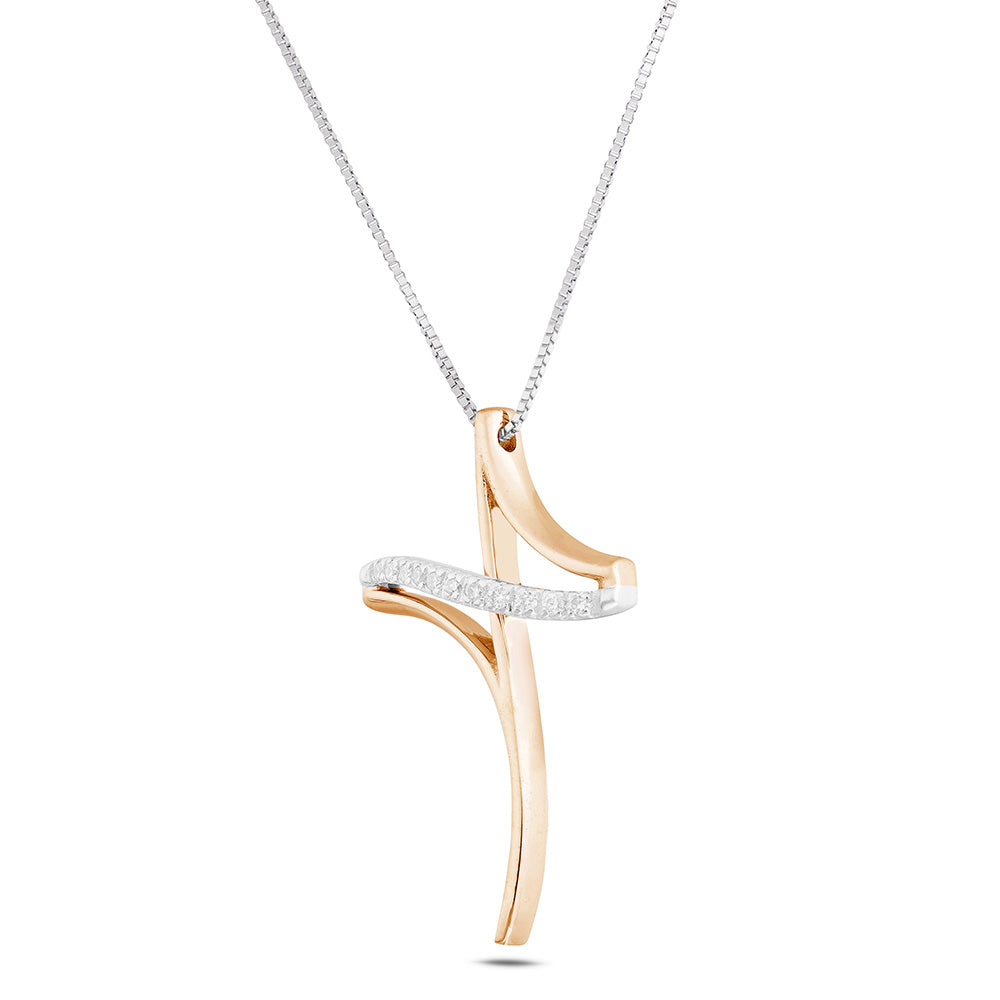 Il ciondolo, dal design contemporaneo, è composto da un elemento lineare che si sovrappone per formare una croce armoniosa. La struttura è impreziosita da 11 diamanti naturali, per un totale di Ct. 0,08, con colore G e purezza SI1, sapientemente incastonati con la tecnica "filo-griffe". La parte sottostante in oro rosa crea un effetto tridimensionale, aggiungendo profondità e fascino al gioiello.