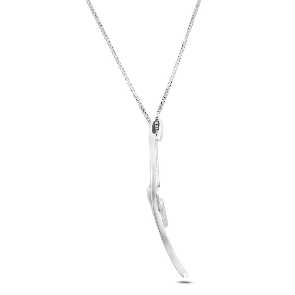 La catena veneziana in oro bianco sostiene un ciondolo dal design distintivo: un elemento bombato lucido si fonde elegantemente con un elemento lineare impreziosito da ben 27 diamanti naturali (totale Ct. 0,16). I diamanti, con colore G e purezza SI1, sono incastonati con la tecnica "filo-griffe", esaltando la loro brillantezza su tutta la superficie. Il risultato è un effetto di luce straordinario che cattura immediatamente lo sguardo.