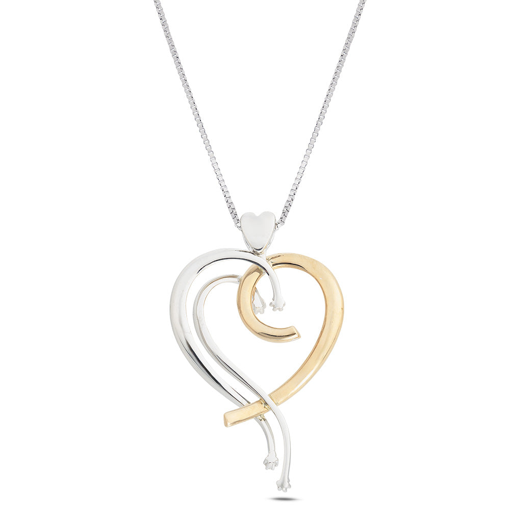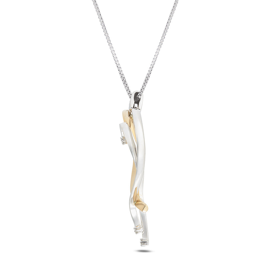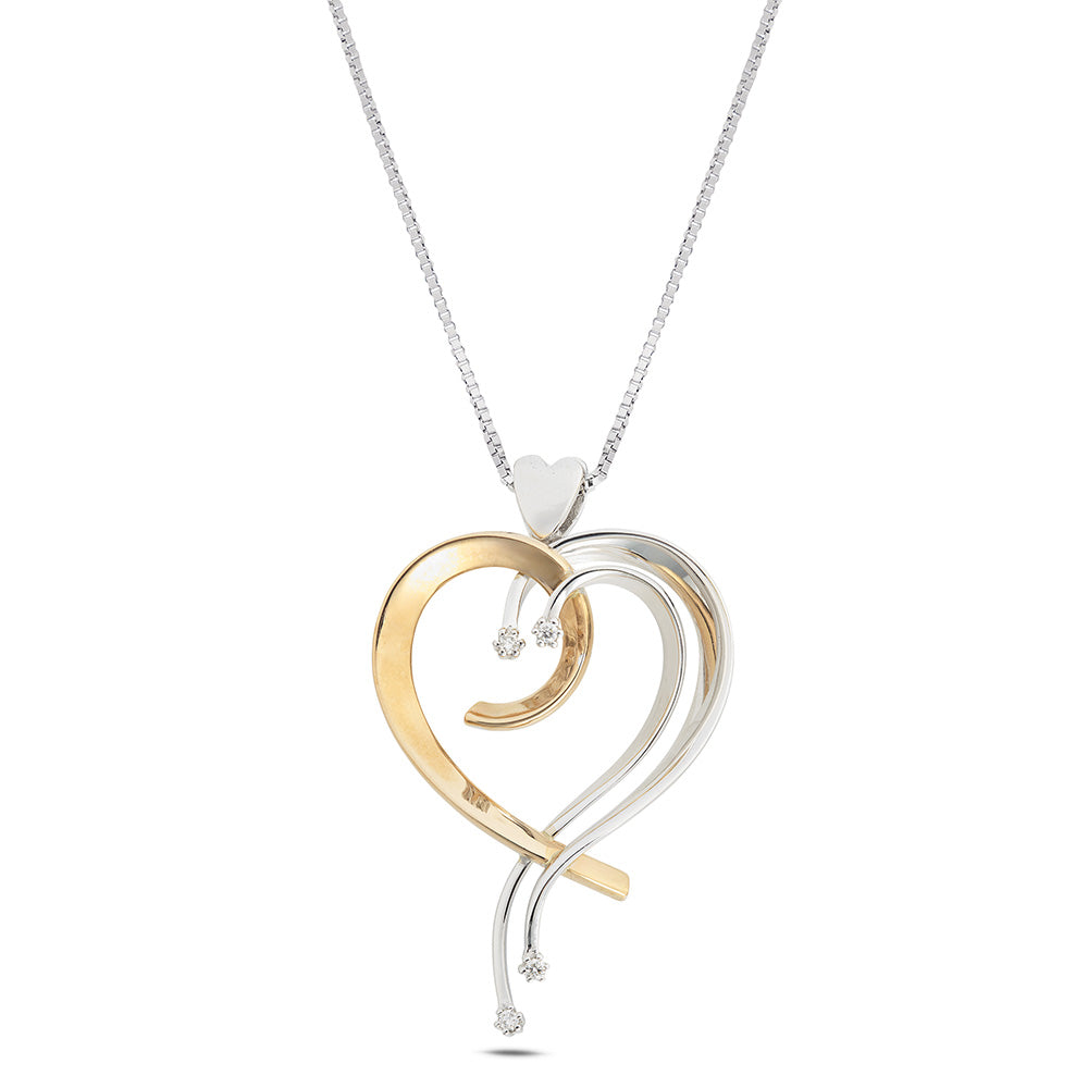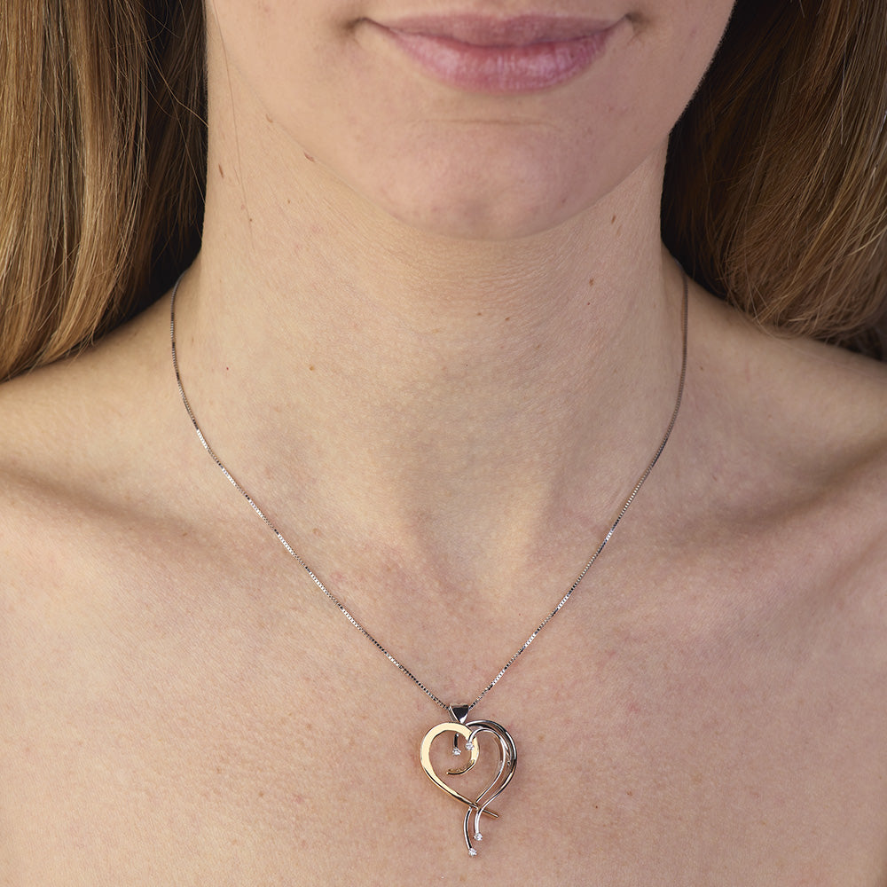 Il ciondolo, vero protagonista, unisce oro bianco e oro rosa in un gioco armonico di contrasti. La parte destra, in oro bianco, si intreccia con la parte sinistra, in oro rosa, dando vita a un cuore dal design contemporaneo. Alle estremità brillano quattro diamanti di Ct. 0,06, Colore G, Purezza SI1, incastonati con la tecnica del "filo-griffe", che esalta la luminosità delle pietre.