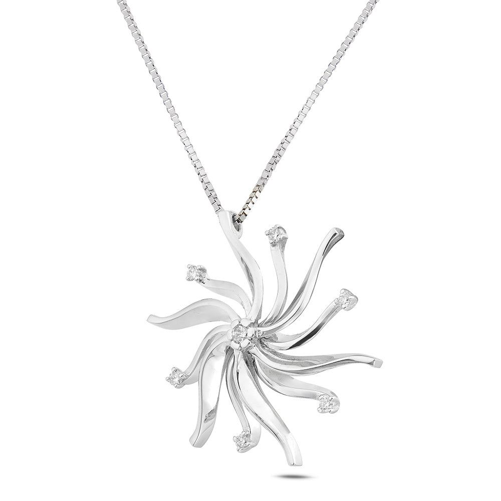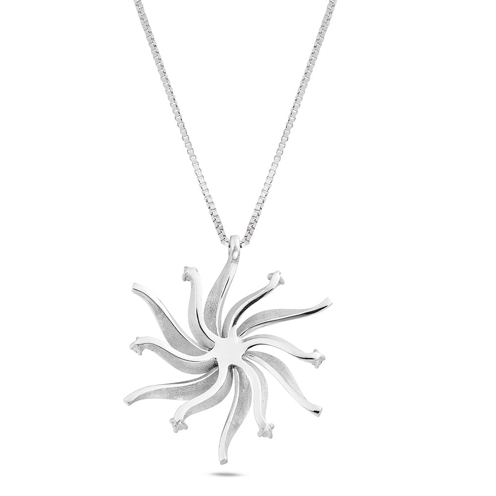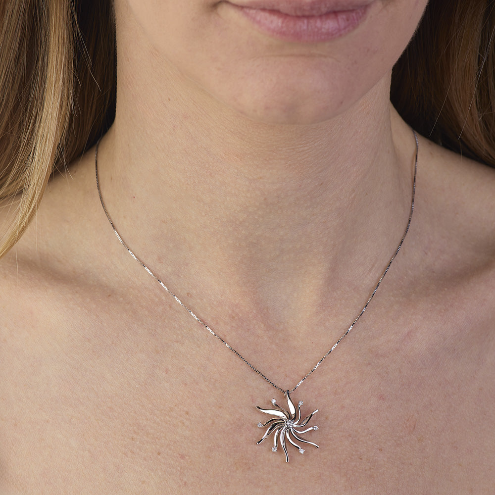 La catena veneziana in oro bianco sostiene un ciondolo unico nel suo genere, composto da dodici elementi lineari specchiati disposti a vortice per evocare la forma del sole. Alle estremità del design brillano sei diamanti incastonati con maestria, mentre al centro spicca un diamante più grande, per un totale di Ct. 0,13. Con Colore G e Purezza SI1, le pietre sono incastonate utilizzando la tecnica "filo-griffe", che esalta la loro luminosità naturale.