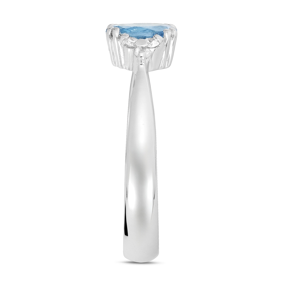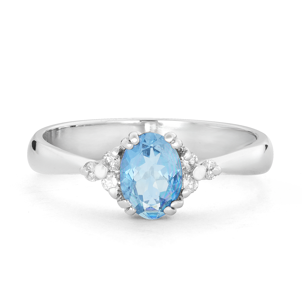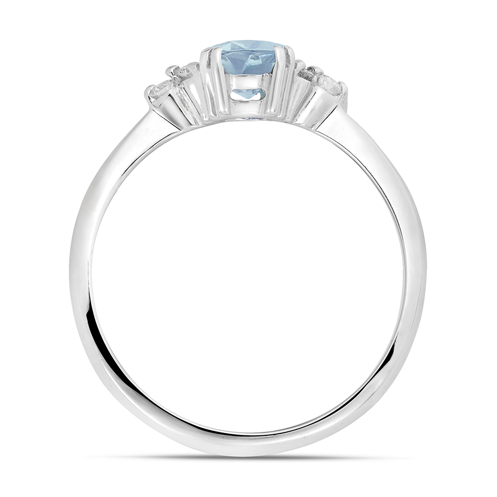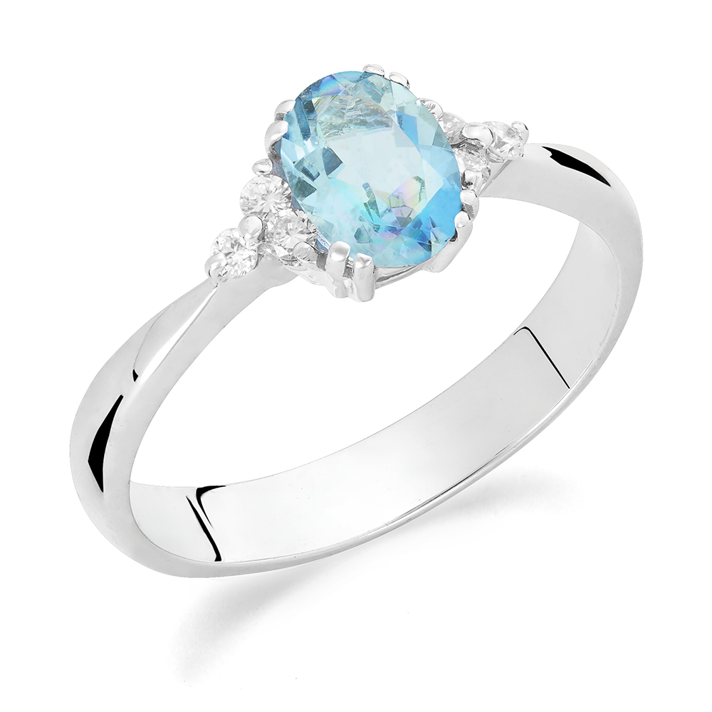 A valorizzare l’acquamarina, sei diamanti naturali di Ct. 0,08 totali, con colore G e purezza Vs1, elegantemente disposti ai lati della pietra centrale per formare due triangoli scintillanti. Questa disposizione dona luminosità e armonia, esaltando il fascino sofisticato dell’anello e creando un gioco di luce unico.