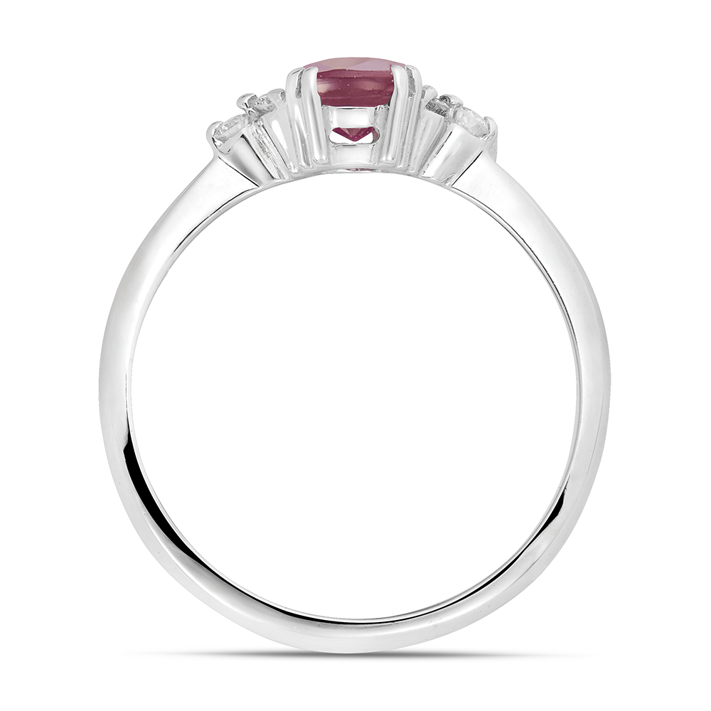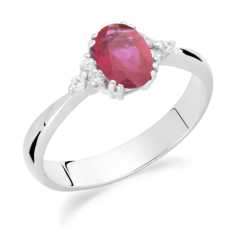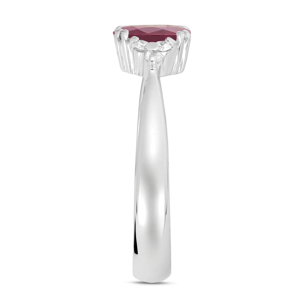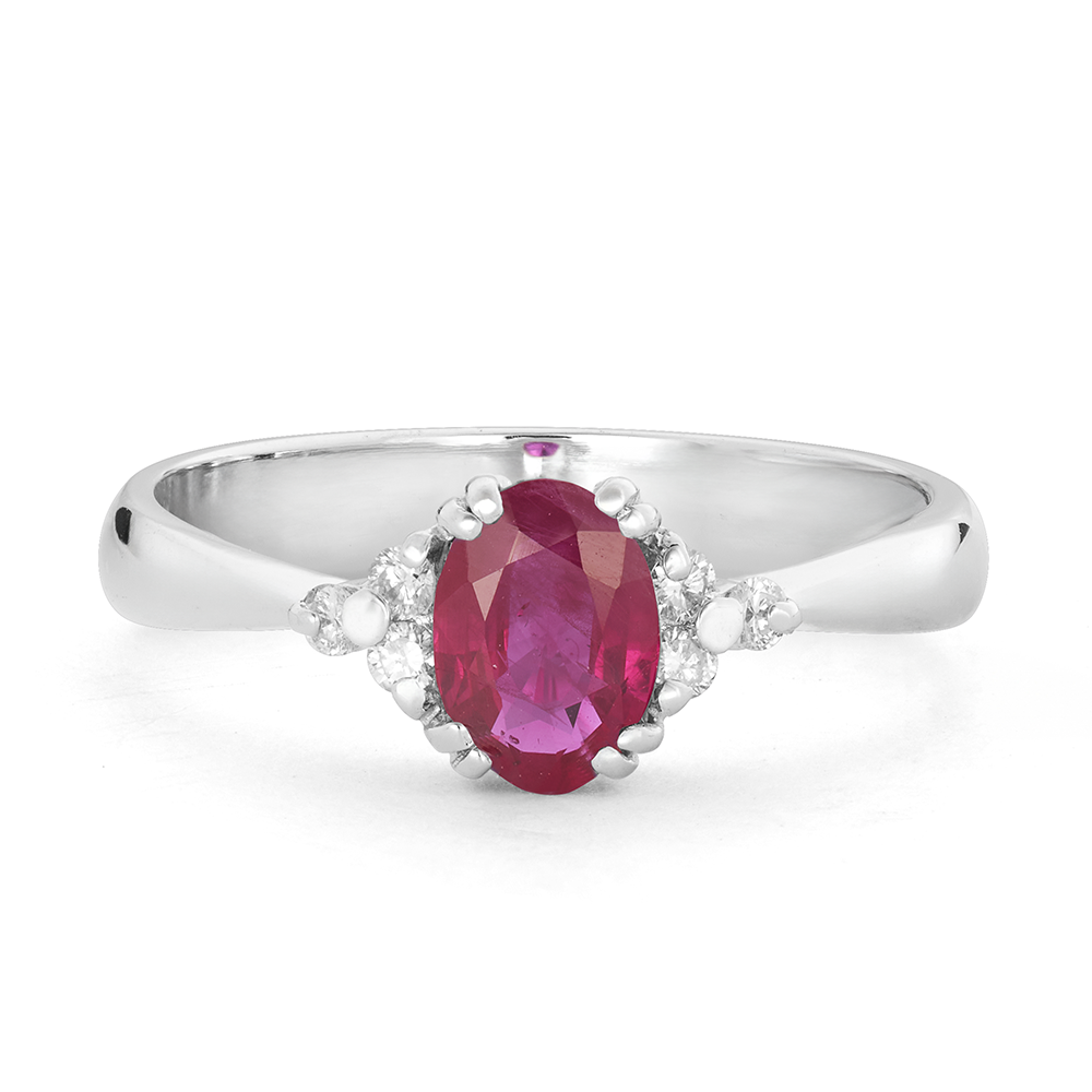 A impreziosire il design, sei diamanti di Ct. 0,08 totali, con colore G e purezza Vs1, disposti in due armoniosi triangoli ai lati della pietra centrale. Questa raffinata disposizione aggiunge luminosità e movimento all’anello, creando un contrasto affascinante tra il candore dei diamanti e la profondità del rubino.