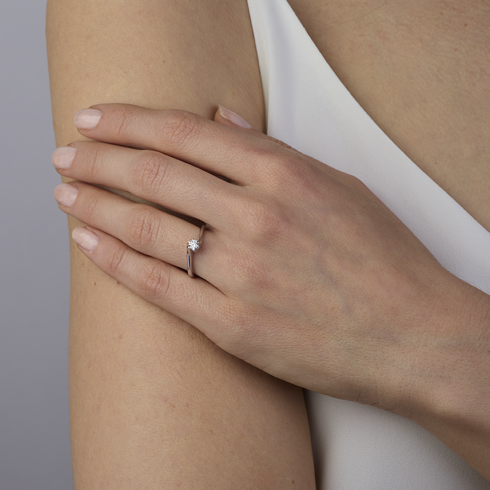 Il protagonista assoluto è un diamante naturale da Ct. 0,20, sorretto da sei griffe che sembrano una mano pronta a custodire il suo splendore. Con colore G e purezza Vs1, questa gemma riflette luce pura e intensa, simbolo di eternità e di legami indissolubili. Perfetto per suggellare un amore autentico, questo diamante è il dettaglio che rende ogni momento unico.