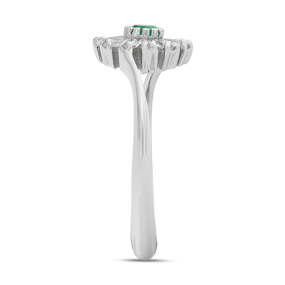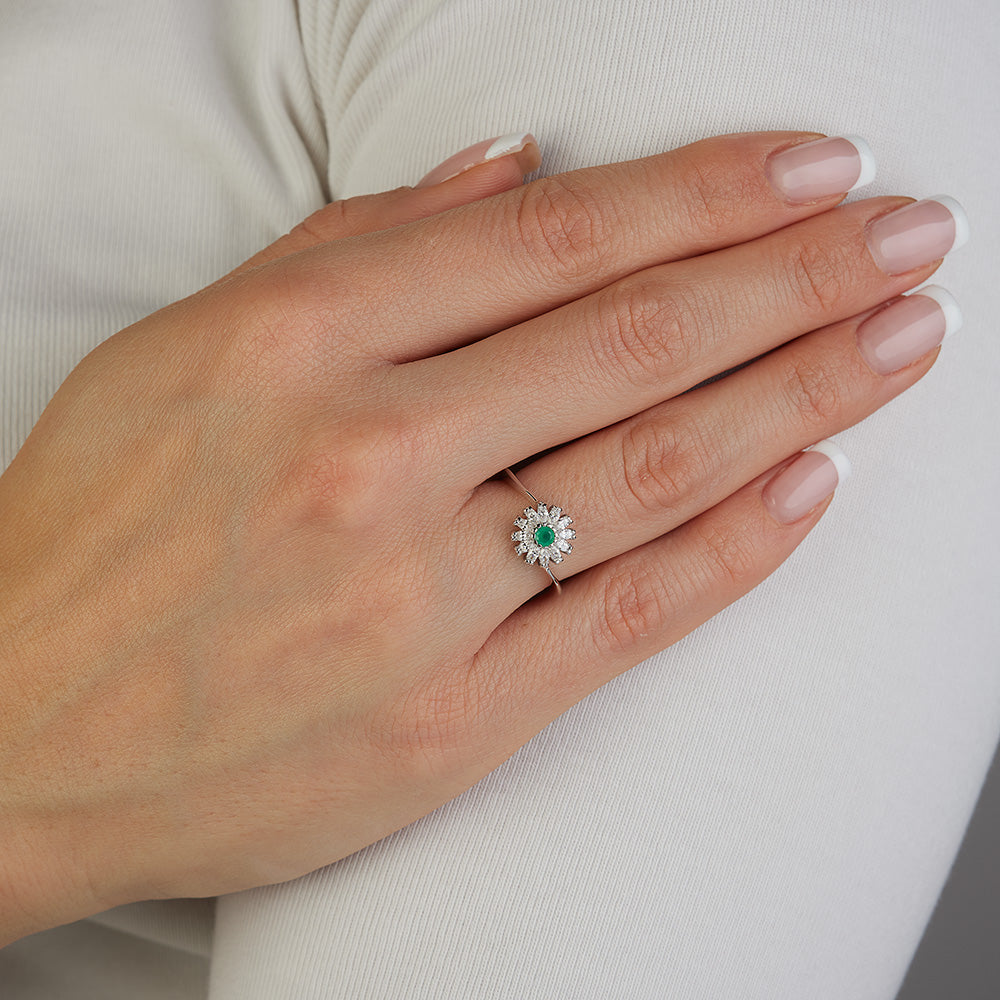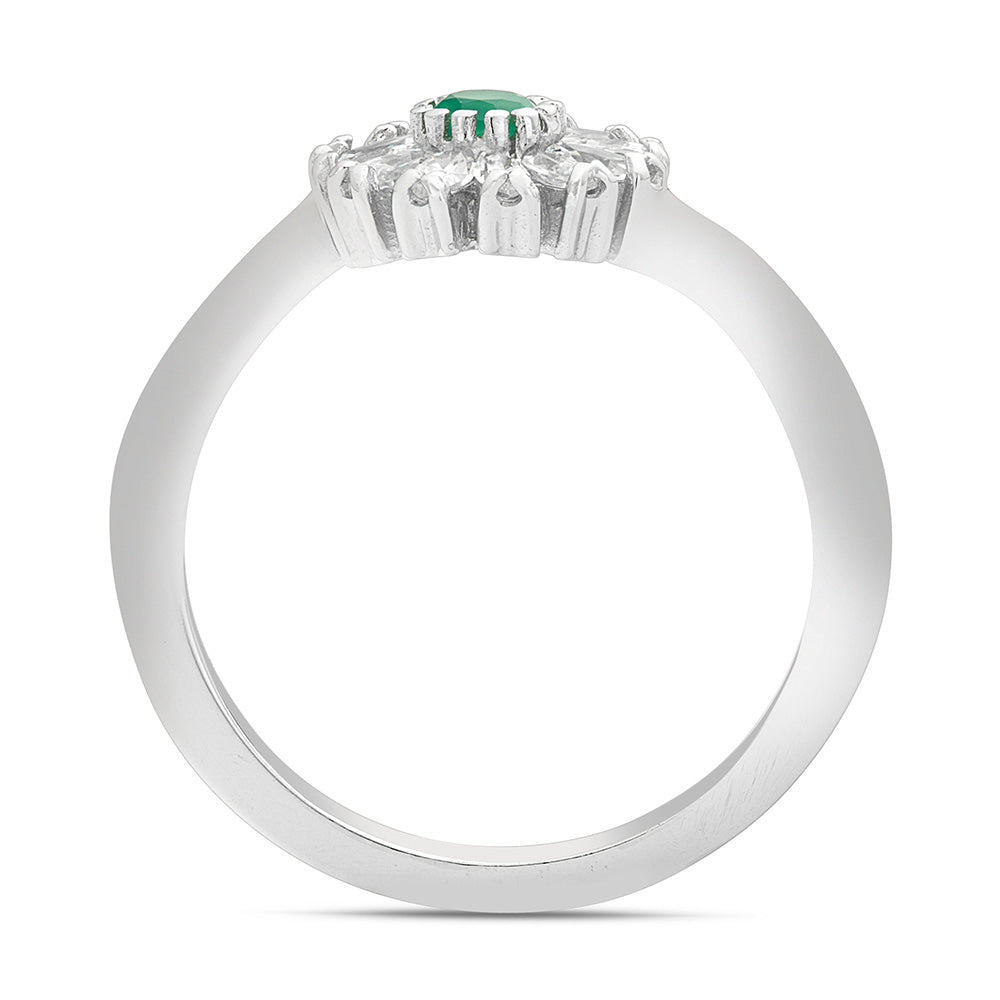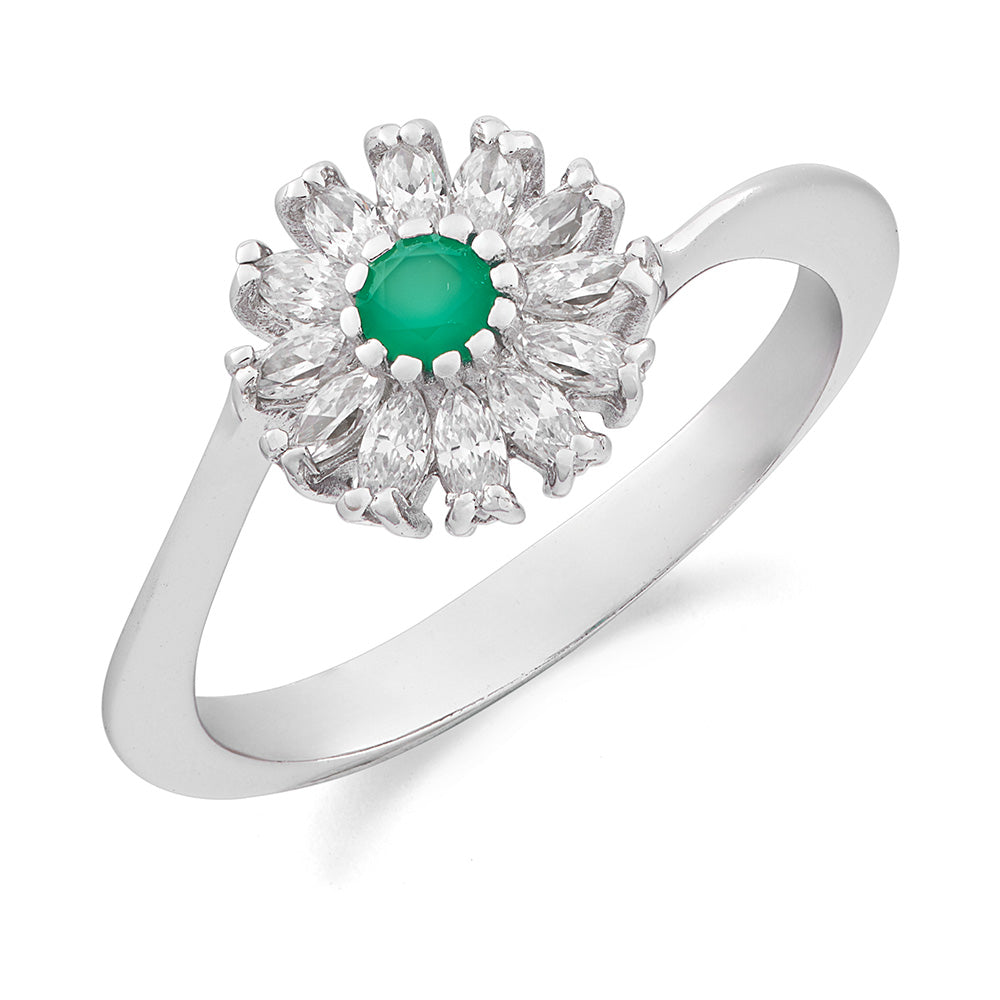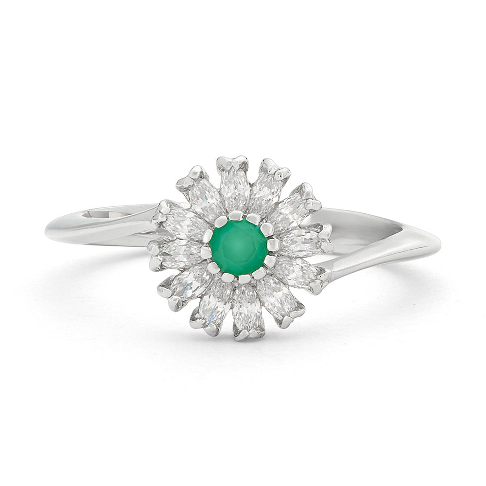 White gold flower ring with white cubic zirconia and green agate