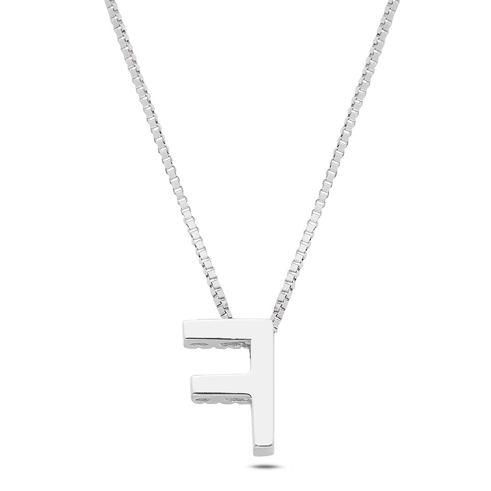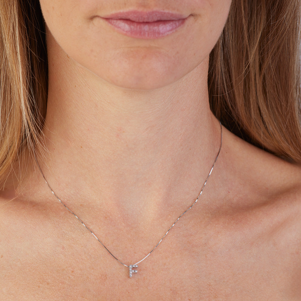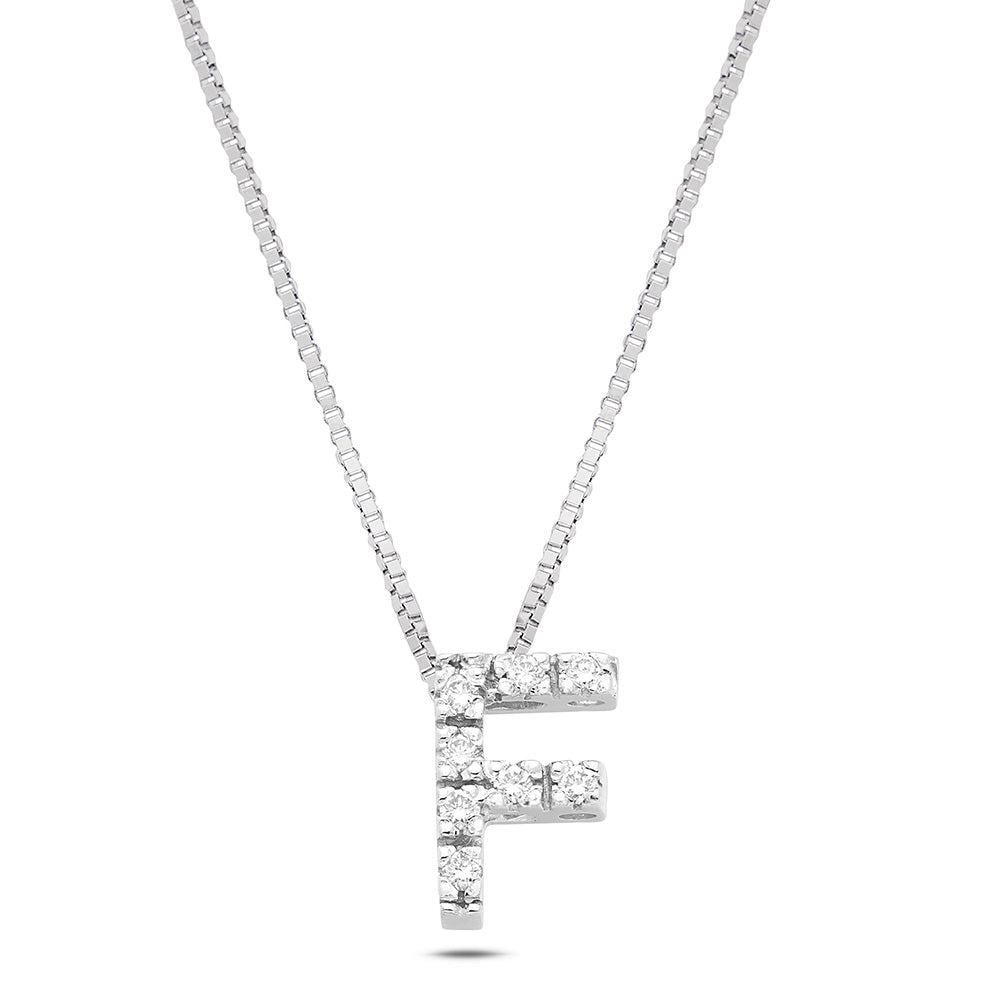 From the "Letters" collection, our 18 Kt. white gold necklace represents a unique and timeless jewel. The pendant, in the shape of the letter "F", is embellished with 8 diamonds , with a total weight of 0.05 Ct. , with color G and purity Vs1, set with the wire-claw technique, which gives elegance and refinement without compromising the safety of the stones.