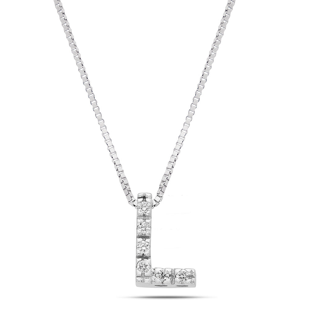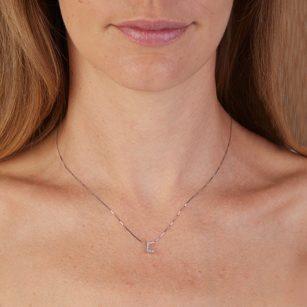 From the "Letters" collection, our 18 Kt. white gold necklace represents a unique and timeless jewel. The pendant, in the shape of the letter "L", is embellished with 6 diamonds , with a total weight of 0.04 Ct , with color G and purity Vs1, set with the wire-claw technique, which gives elegance and refinement without compromising the safety of the stones.