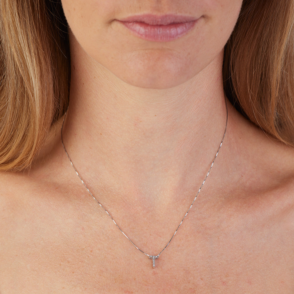 From the "Letters" collection, our 18 Kt. white gold necklace represents a unique and timeless jewel. The pendant, in the shape of the letter "T", is embellished with 6 diamonds , with a total weight of 0.04 Ct , with color G and purity Vs1, set with the wire-griffe technique, which gives elegance and refinement without compromising the safety of the stones.