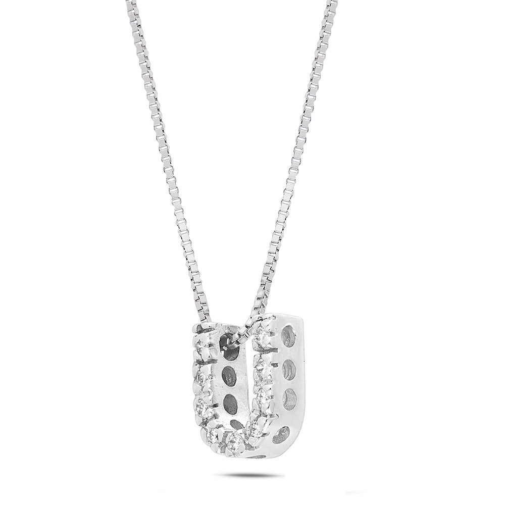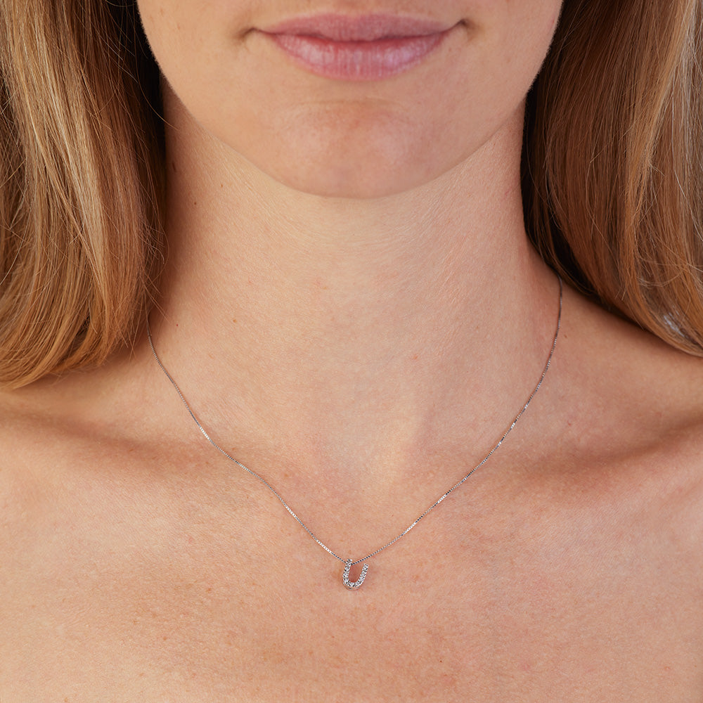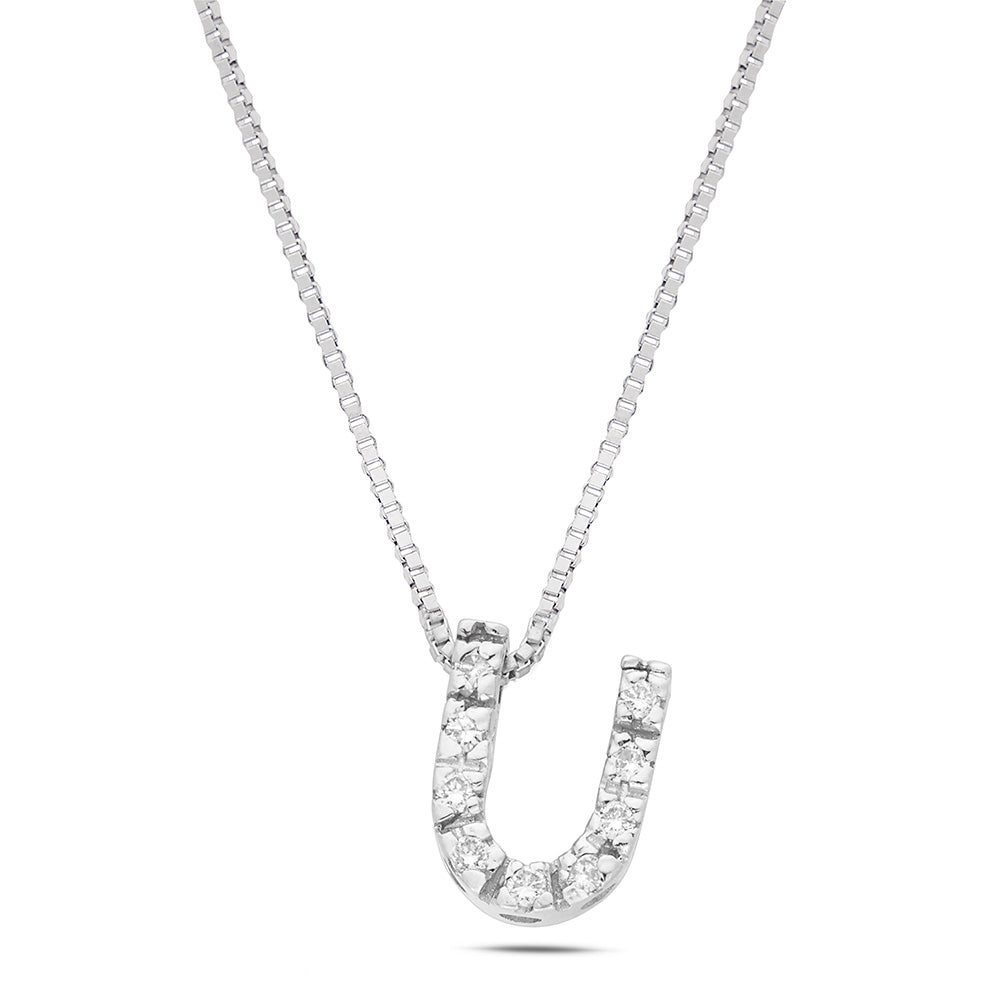 From the "Letters" collection, our 18 Kt. white gold necklace represents a unique and timeless jewel. The pendant, in the shape of the letter "U", is embellished with 9 diamonds , with a total weight of 0.06 Ct , with color G and purity Vs1, set with the wire-claw technique, which gives elegance and refinement without compromising the safety of the stones.