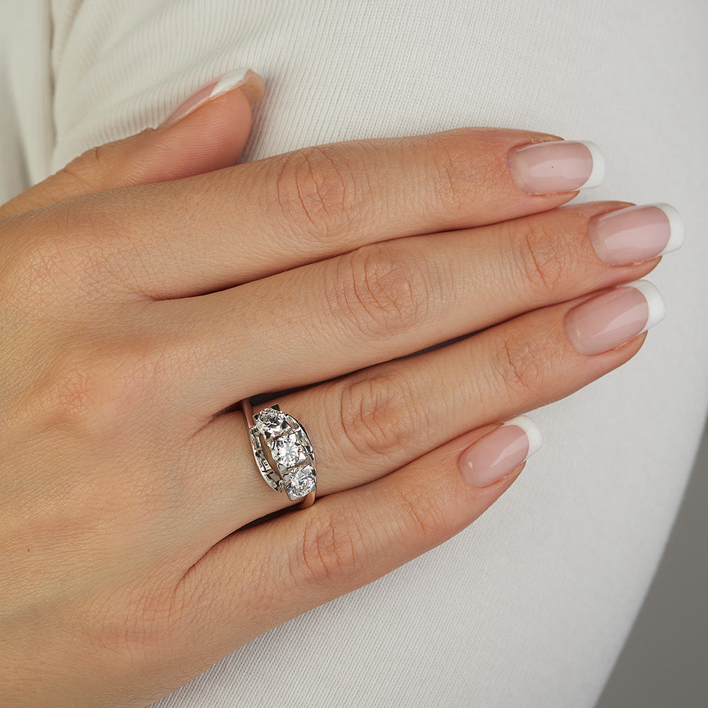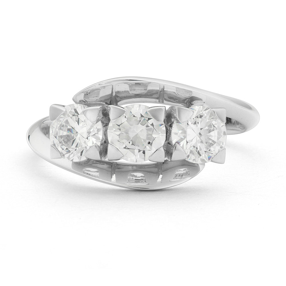 Une bague Trilogy en or blanc 18 carats , réalisée selon la technique ancienne de micro-coulée et de fabrication artisanale, est l'emblème du style contemporain et à l'unisson de l'élégance intemporelle.