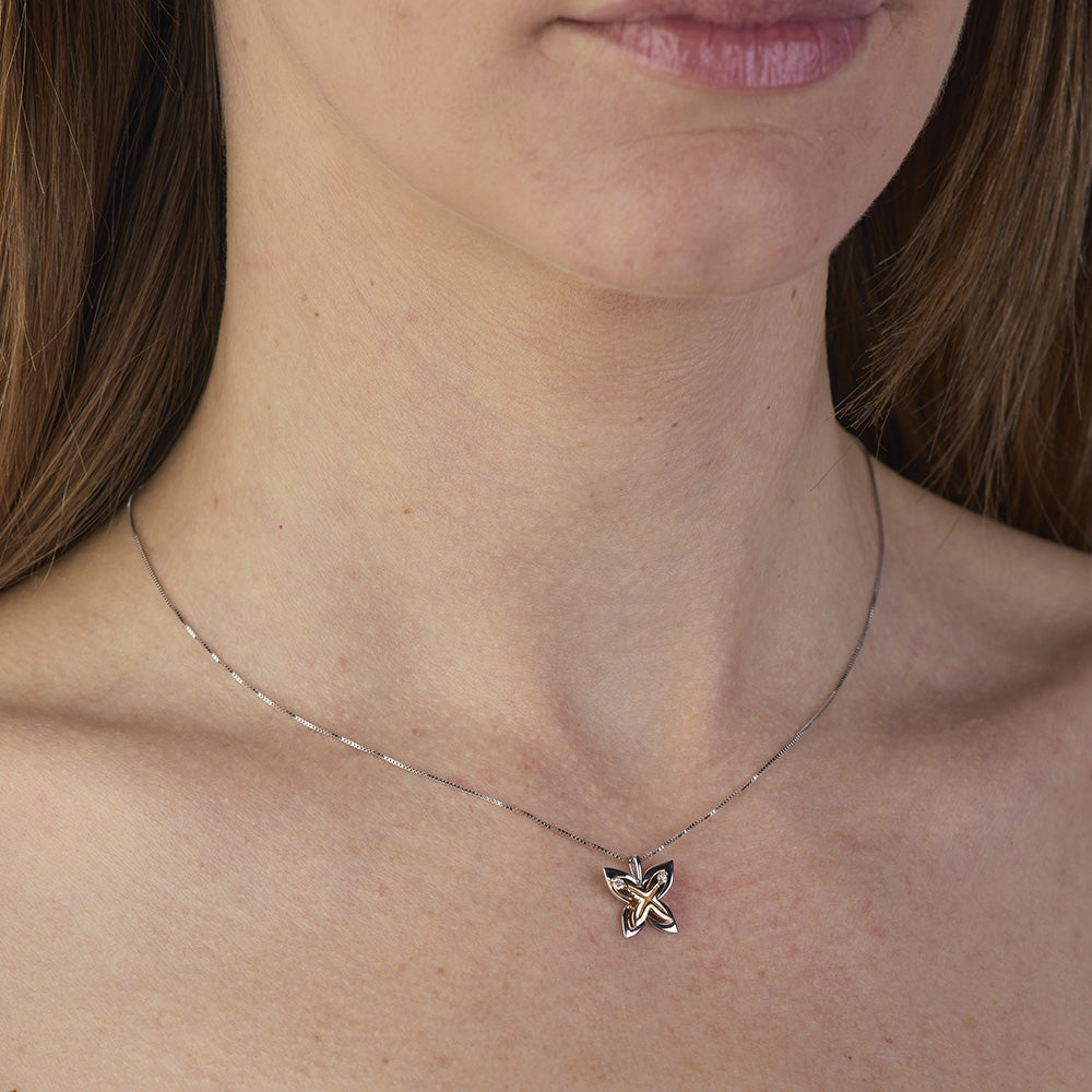 Due diamanti naturali da un totale di Ct. 0,05, di colore G e purezza SI1, impreziosiscono il design con un tocco di luce. L’incastonatura “filo-griffe”, eseguita con precisione artigianale, garantisce un’ottima tenuta delle gemme. L’intero gioiello è realizzato a mano mediante l’antica tecnica della microfusione, che ne esalta il valore e la qualità, per un autentico Made in Italy.